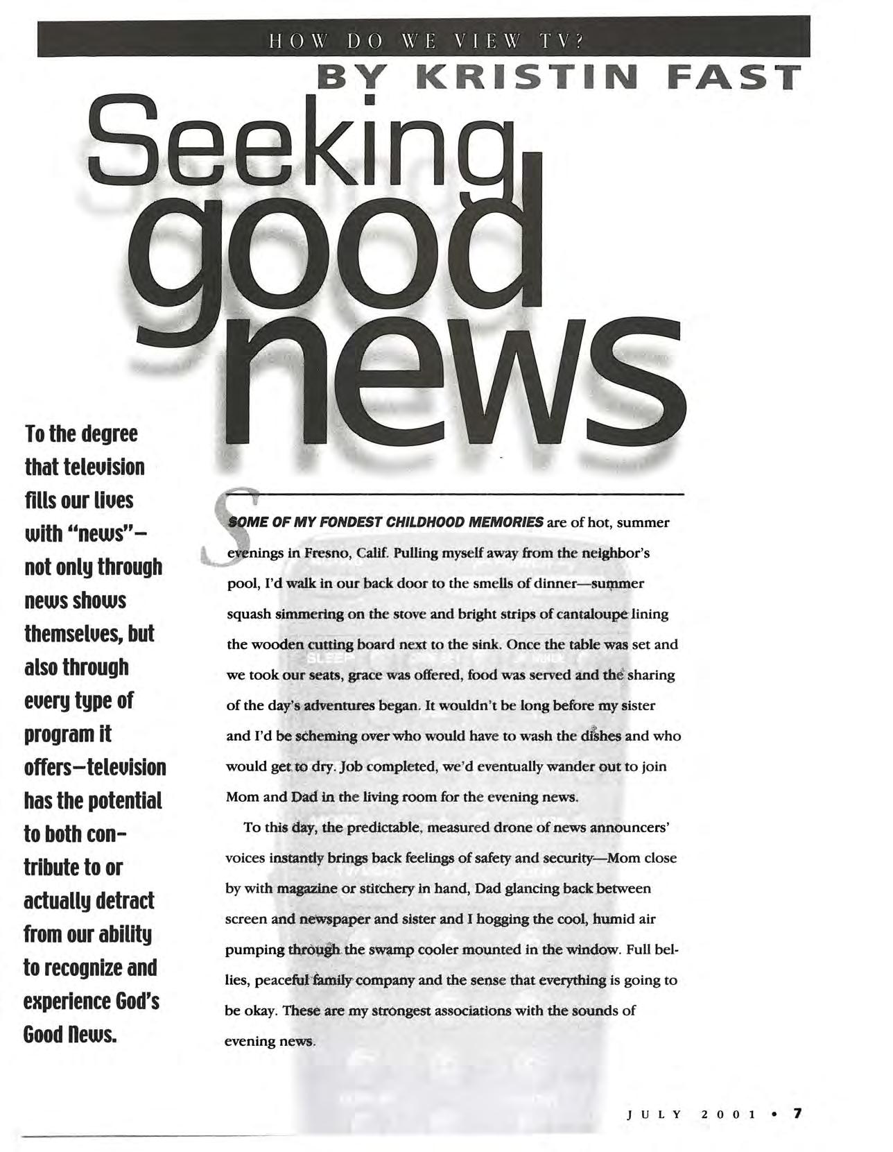 Our first article reveals the reflections of a self-confessed lV addict and suggests several ways the church can become the place to escape to instead of the couch in front of the tube . Kristin Fast takes a different approach in our second article, thoughtfully reflecting on her own experiences with media news and exploring how television can both contribute to and detract from our ability to recognize God's Good News Our third article shares the viewpoints and experiences of two MBs who have spent time working in the television industry-from the set of Touched by an Angel to programming for the Christian Broadcasting Network.