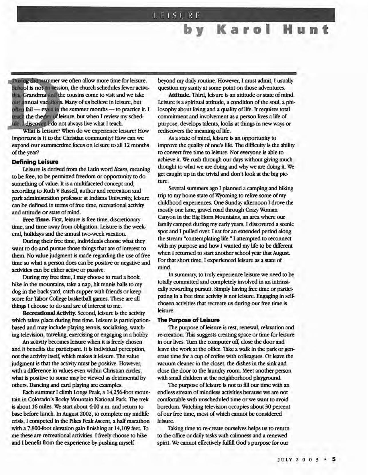 We often associate the summer months with family vacations and the opportunity for recreational pursuits. But vacations, recreation and other free time activities don't always leave us refreshed. We want to follow the advice of Jesus to his disciples when he said, "Come apart and rest a while." But the reality is more in keeping with an adaptation of those words penned anonymously, "Come apart and rest a while before you come apart." The first article in this month's feature section challenges us to refocus our mind-set when engaged in leisure time activities. Leisure, says author Karol Hunt, is about re-creation as much as recreation.
