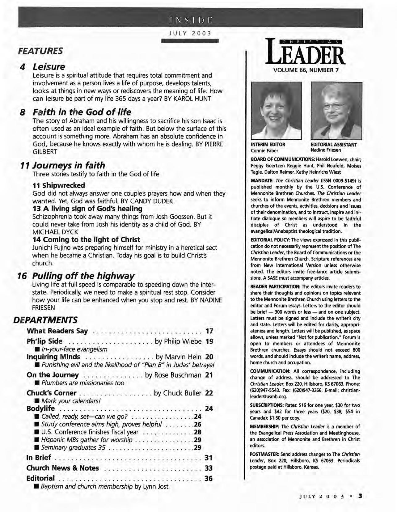 COMMUNICATION: All correspondence, including change of address, should be addressed to The Christian Leader, Box 220, Hillsboro, KS 67063. Phone: (620)947-5543. Fax: (620)947-3266. E-mail: christianleader@usmb.org.