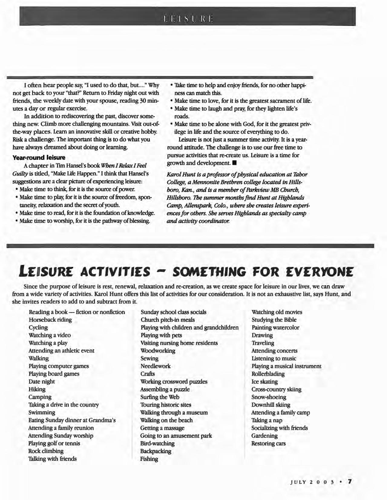 Karol Hunt is a professor ofphysical education at Tabor College, a Mennonite Brethren college located in Hillsboro, Kan., and is a member ofParkview MB Church, Hillsboro. The summer months find Hunt at Highlands Camp, Allenspark, Colo., where she creates leisure experiences for others. She serves Highlands as specialty camp and activity coordinator.
