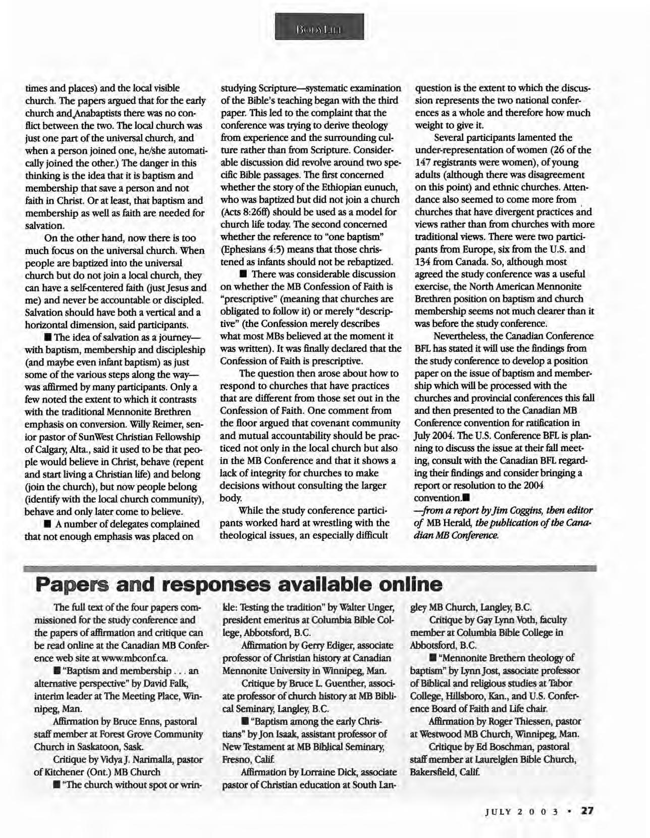Baptism and church membership. Does the topic stir passions in you? What makes the issue worth dying for-as Hans Denck did when he was drowned in 1527 for insisting on baptizing adult believers? Why would church leaders spend an entire weekend together discussing just this one topic-as did Mennonite Brethren from across Canada (with a few from the U.S.) less than two months ago? (See pages 26-27.) Why does the issue prompt a pastor in California to call me a week after the study conference to check signals?