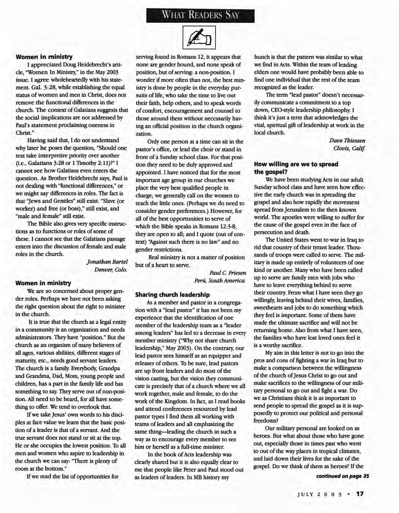 READER PARTICIPATION: The editors invite readers to share their thoughts and opinions on topics relevant to the Mennonite Brethren Church using letters to the editor and Forum essays. Letters to the editor should be brief - 300 words or less - and on one subject. Lettersmust be signed and include the writer's city and state. Letters will be edited for clarity, appropriateness and length. Letters will be published, as space allows, unless marked "Not for publication.' Forum is open to members or attendees of Mennonite Brethren churches. Essays should not exceed 800 words, and should include the writer's name, address, home church and occupation.