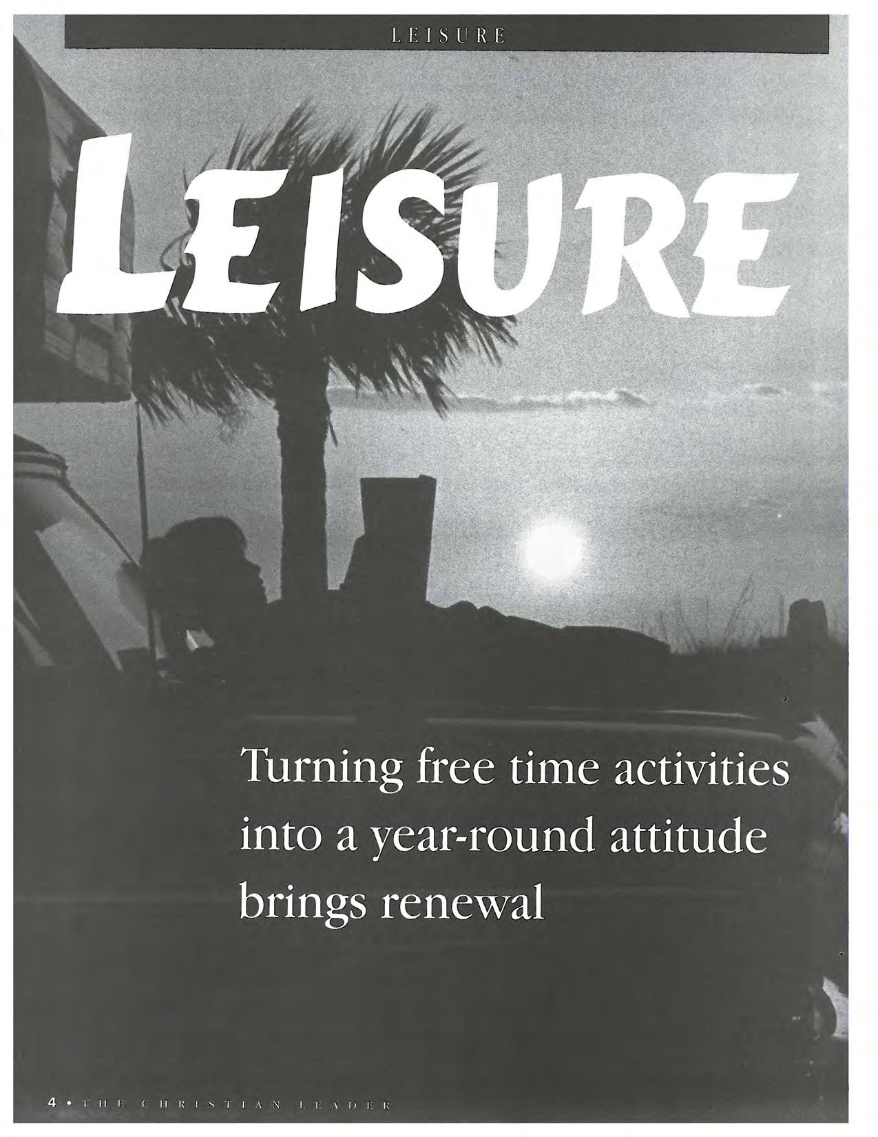 we often allow more time for leisure. the church schedules fewer activie cousins come to visit and we take Many of us believe in leisure, but the summer months - to practice it. I leisure, but when I review my sched60 not always live what I teach. leisure? When do we experience leisure? How important is it to the Christian community? How can we expand our summertime focus on leisure to all 12 months of the year?