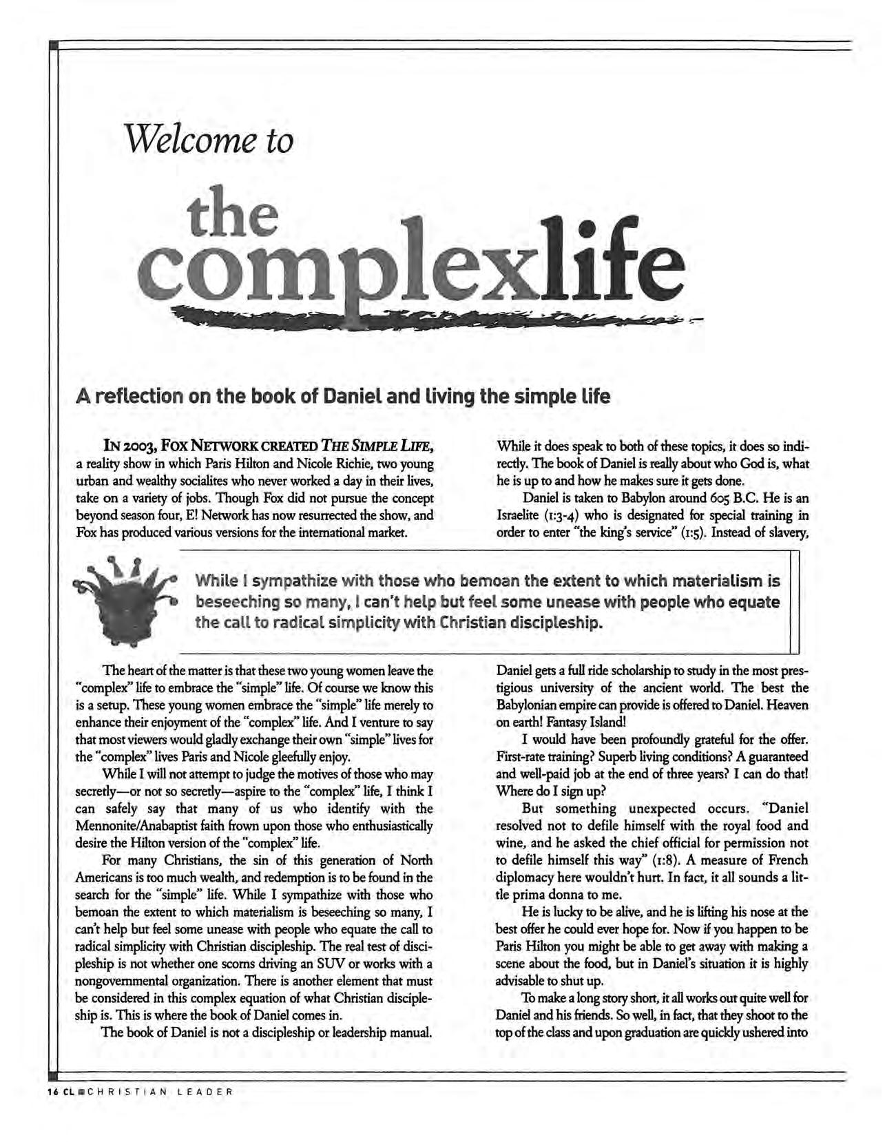 The lure of materialism can tempt us at times to equate a simple lifestyle with Christian discipleship . While God may call some people to the simple life, he calls others of us to the complex life. The book of Daniel suggests that ones simple-or complex-economic lifestyle is secondary to a much more important concern.