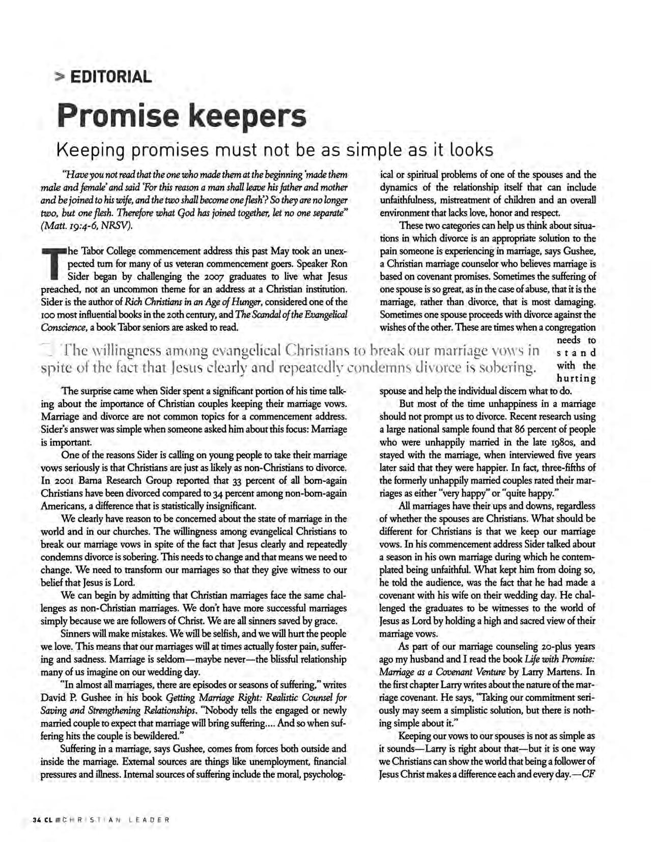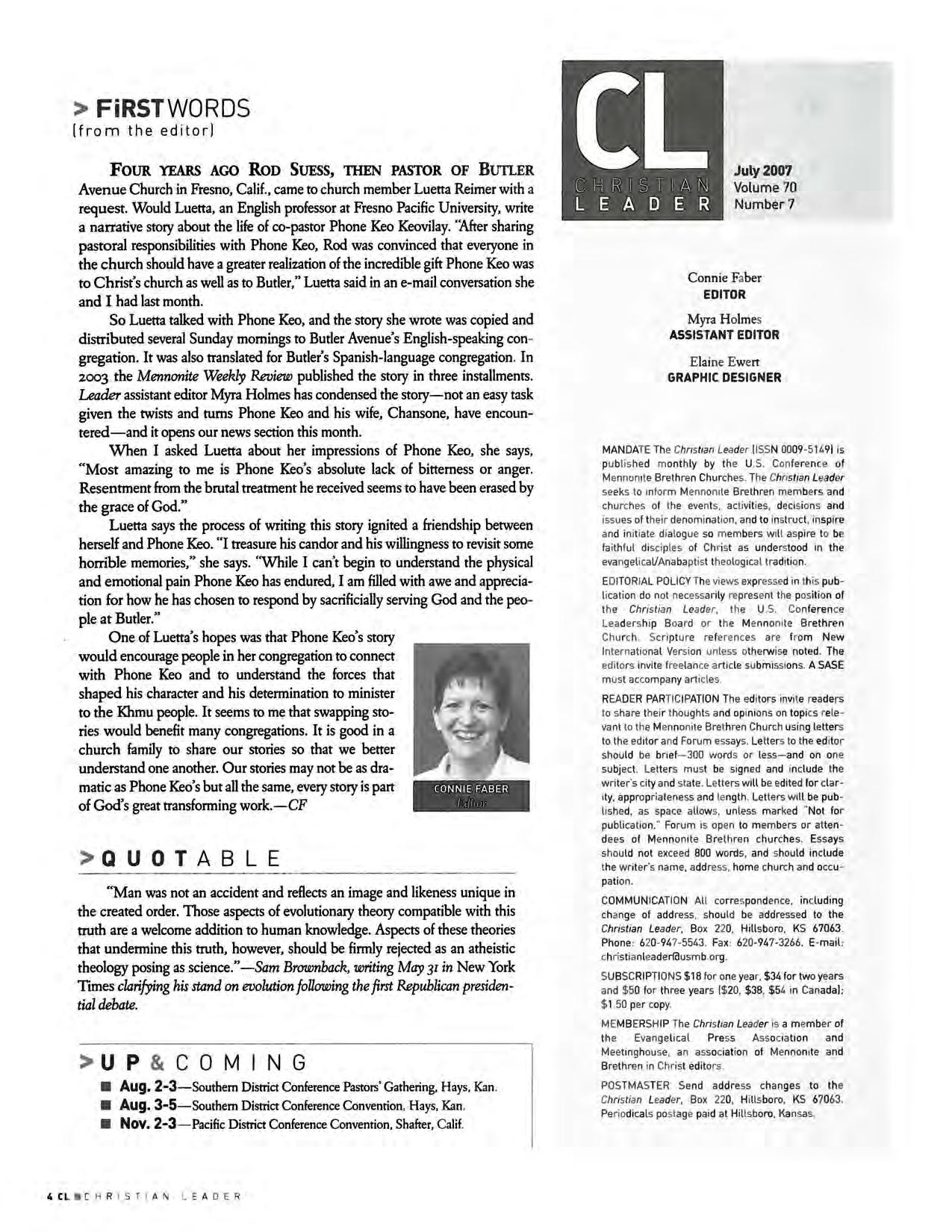 EDITOR IAL POLICY The views ex pressed in t his publication do not nec essar ily re pres ent t he pOS it i on of t h e Chris tia n Leader, th e U.S. Co nferen ce Lea de r shi p Boa r d or t he Men noni te Brethren Chu r ch Scrip t ure re ferenc es are f r om N ew Intern ationa l Ver si on unless ot he rwi se noted The edi tor s invi t e free lan ce article submi ssi on s A SASE m ust ac compa ny art icles.
