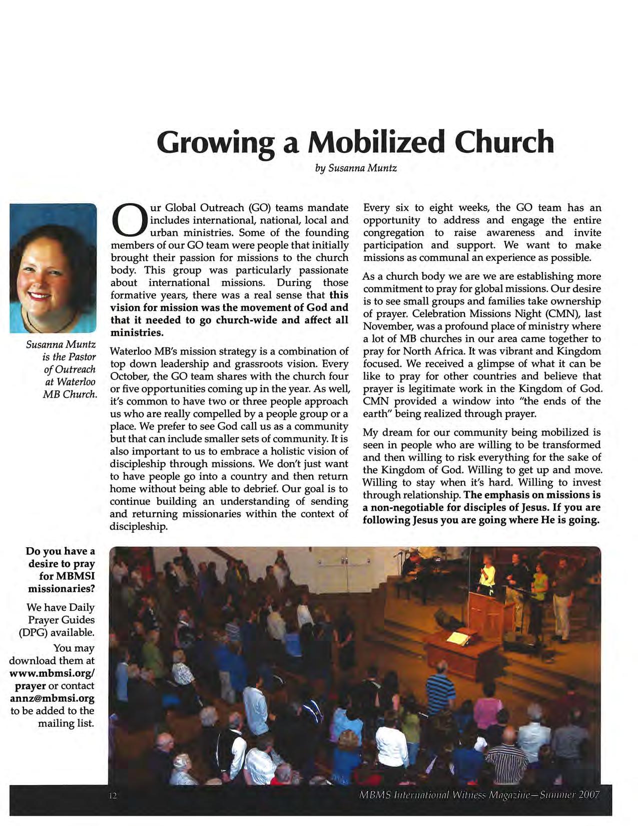 As a church body we are we are establishing more commitment to pray for global missions. Our desire is to see small groups and families take ownership of prayer. Celebration Missions Night (CMN), last November, was a profound place of ministry where a lot of MB churches in our area came together to pray for North Africa. It was vibrant and Kingdom focused. We received a glimpse of what it can be like to pray for other countries and believe that prayer is legitimate work in the Kingdom of God CMN provided a window into "the ends of the earth" being realized through prayer.