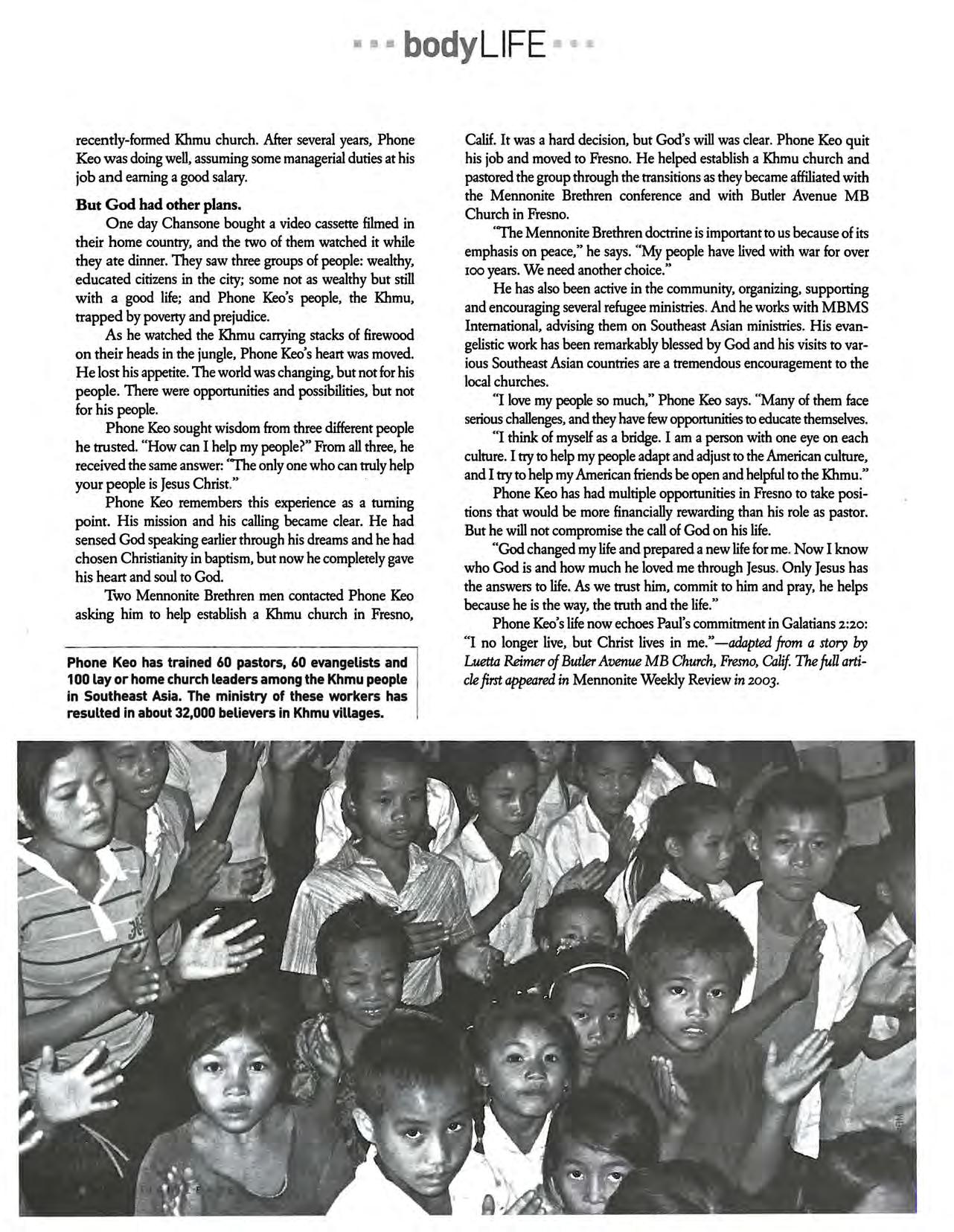 So Luetta talked with Phone Keo, and the story she wrote was copied and distributed several Sunday mornings to Butler Avenue's English-speaking congregation. It was also translated for Butler's Spanish-language congregation . In 2003 the Mennonite Weekly Review published the story in three installments. Leader assistant editor Myra Holmes has condensed the story-not an easy task given the twists and turns Phone Keo and his wife, Chansone, have encountered -and it opens our news section this month