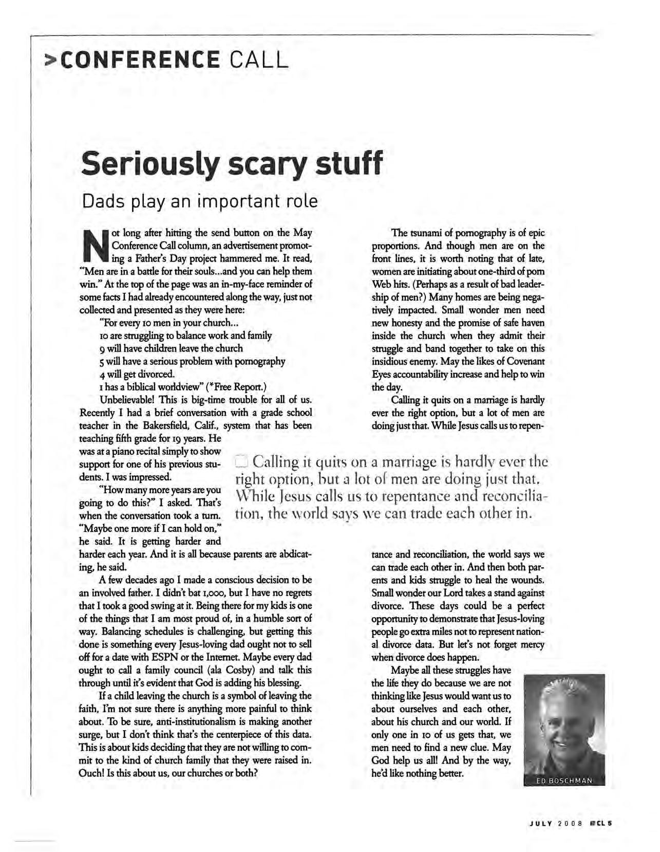 Not long after hitting the send button on the May Conference Call column, an advettisement promoting a Father's Day project hammered me. It read, "Men are in a battle for their souls and you can help them win." At the top of the page was an in-my-face reminder of some facts I had already encountered along the way, just not collected and presented as they were here: