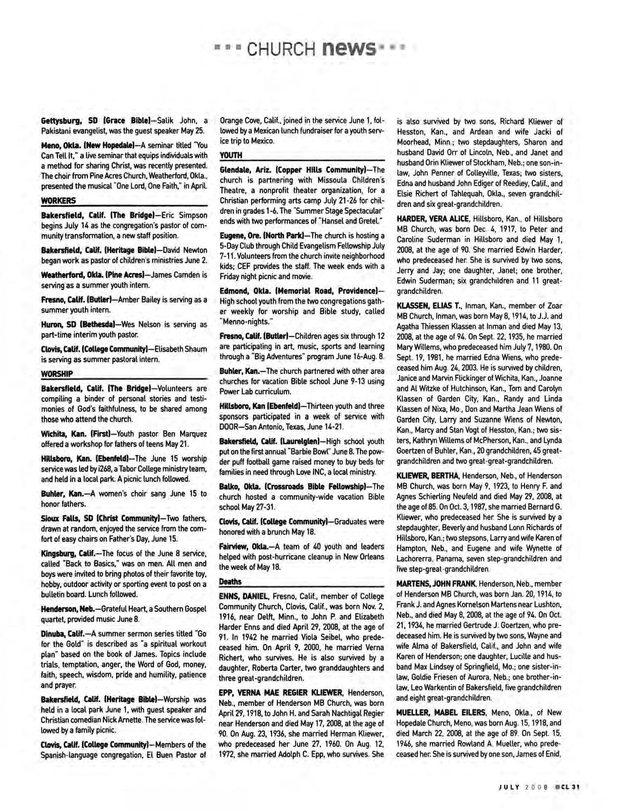 KLASSEN, ELIAS T., Inman, Kan., member of Zoar MB Church, Inman, was born May 8, 1914, to J.J. and Agatha Thiessen Klassen at Inman and died May 13, 2008, at the age of 94. On Sept. 22, 1935, he married Mary Willems, who predeceased him July 7, 1980. On Sept. 19, 1981, he married Edna Wiens, who predeceased him Aug 24, 2003. He is survived by children, Janice and Marvin Flickinger of Wichita, Kan., Joanne and Al Witzke of Hutchinson, Kan., Tom and Carolyn Klassen of Garden City, Kan., Randy and Linda Klassen of Nixa, Mo , Don and Martha Jean Wiens of Garden City, Larry and Suzanne Wiens of Newton, Kan., Marcy and Stan Vogt of Hesston, Kan.; two sisters, Kathryn Willems of McPherson, Kan. , and Lynda Goertzen of Buhler, Kan , 20 grandchildren, 45 greatgrandchildren and two great -great-grandchildren