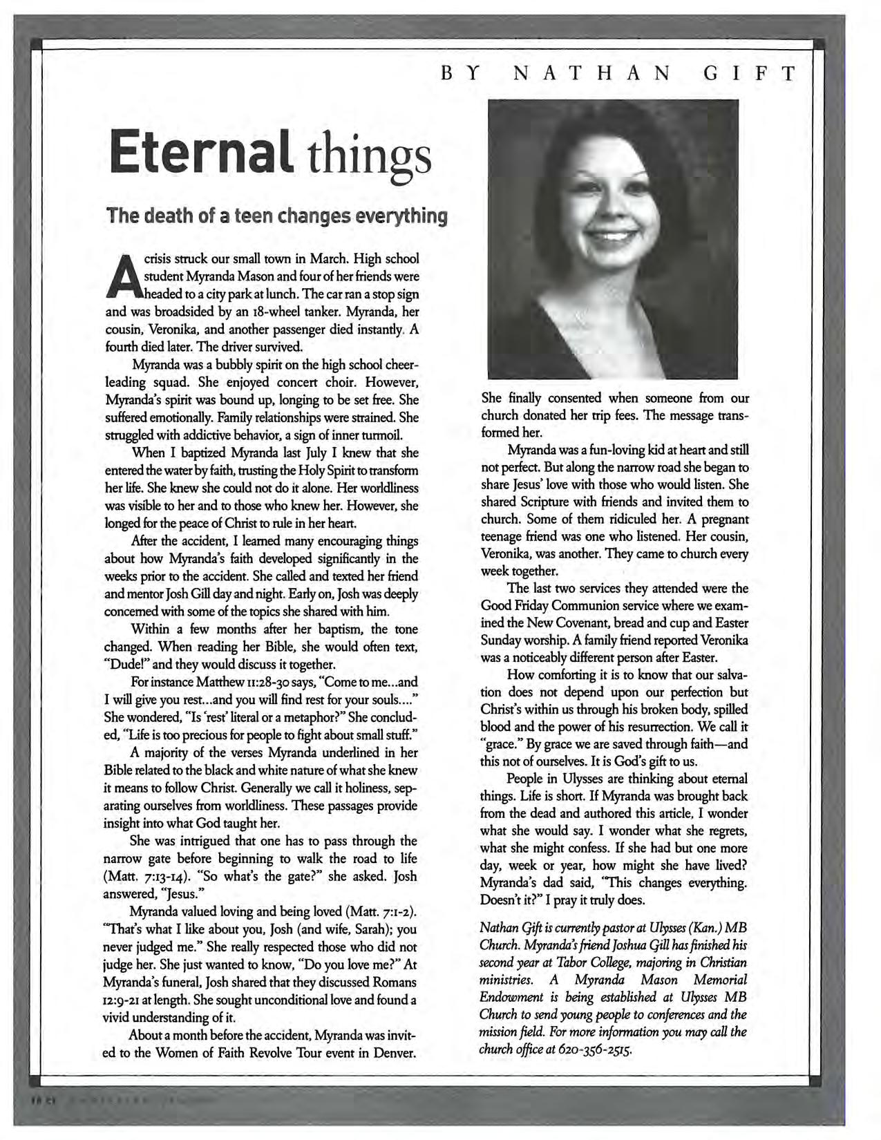 Student Ministry Pastor: En id Mennonite Brethren Church in Enid, Okla., is seeking a full-ti me Student Ministry Pastor This person will oversee and work with students grades 7-12 and will work with a sen ior and an associate pastor. EMBC is a congregation of approximately 300 members and is located in north central Oklahoma Resumes can be sent to Search Team, Enid MB Church, 2500 N Van Buren, En id, OK 73703 or by email to searc h team chair Wa rre n De ll at warren_delUo hotmail.com We wi ll begin reviewing resumes July 15 (1/1)