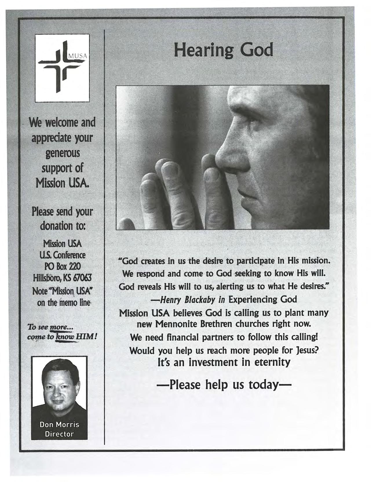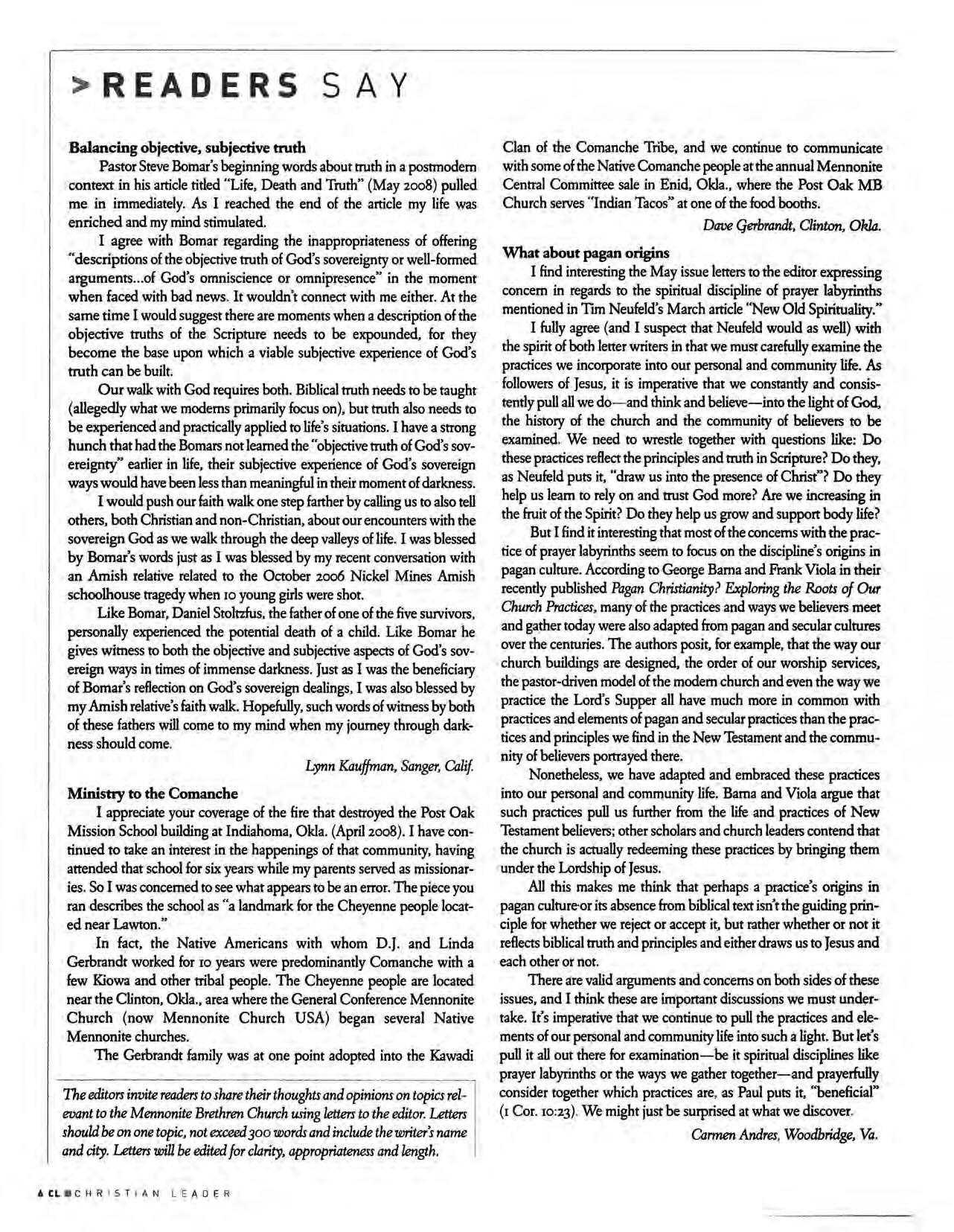 READER PARTICIPATION The editors invite rea ders to shar e their thou ghts and opinions on topics relevant t o t he Mennonite Brethren Chu rch using letters to the edi tor and For um ess ays. Letters to the editor should be br ief-300 words or less- and on one subject Letters must be signed and include the wri ter 's city and state Letters will be edi ted for clarity, appropr iateness and length Letters will be published, as spa ce allows, unless marked - Not for publicationForum is open to members or attendee s of Mennonite Brethren churche s. Essays should not exceed 800 words, and should include the writer's name, address, home church and occupation