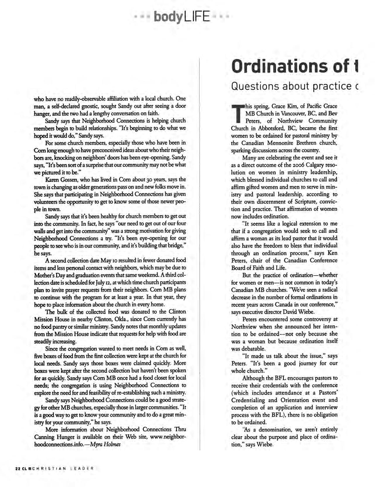EDITORIAL POLICY The views expre ss ed in this publica t ion do not necessarily re presen t the position of th e Ch ris tia n Leade r , t he U S Co nf erenc e Le ade rsh ip Board or t he Mennoni te Bre t hren Ch urch Scripture refere nces are from New International Version un less otherwise noted The editors invite f ree lance article submissions A SASE m ust accompany article s