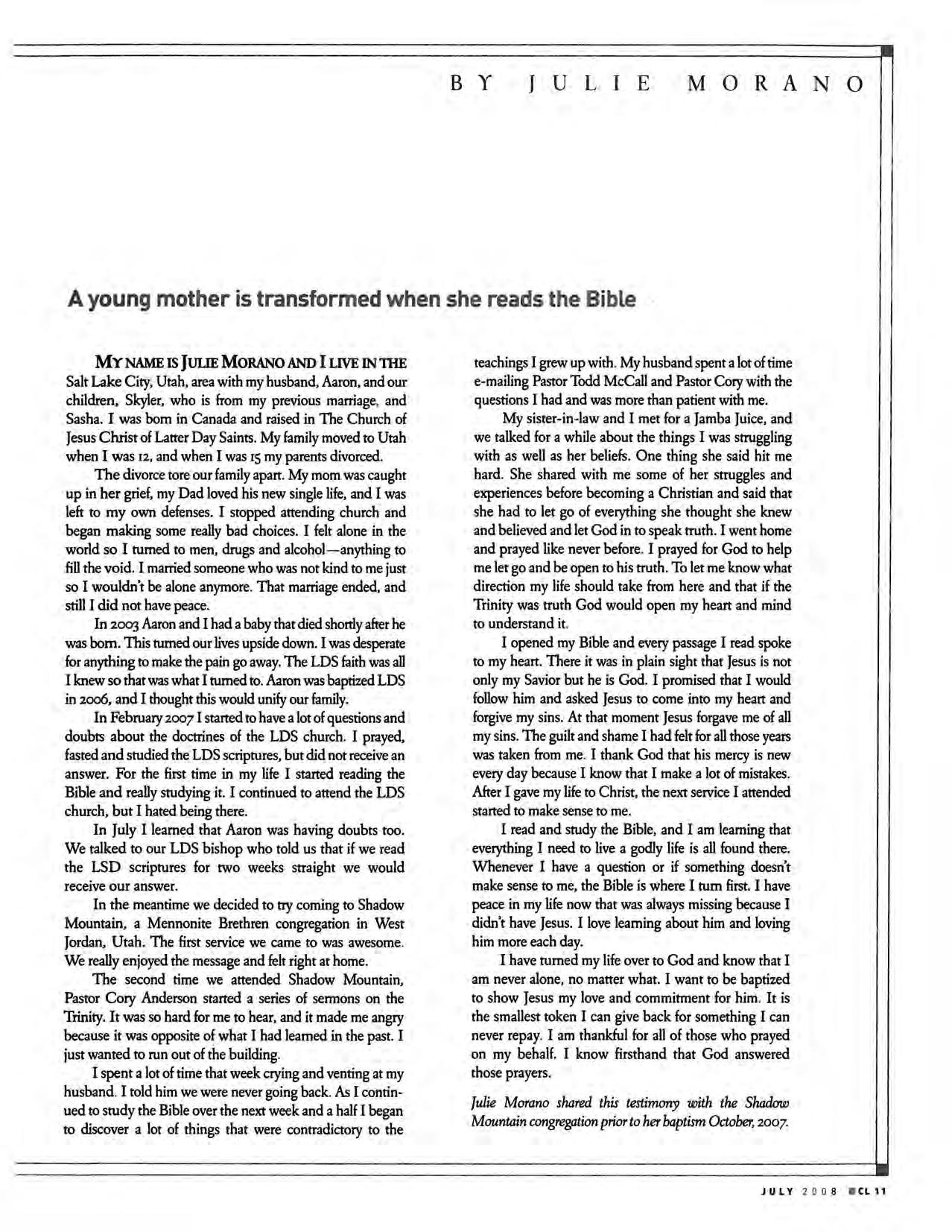 Raised in The Church of Jesus Christ Latter Day Saints , a young mother struggles with questions and studies the LDS scriptures as directed by church leaders . Finding no answers, Julie turns to the Bible and finds power in God's Word.