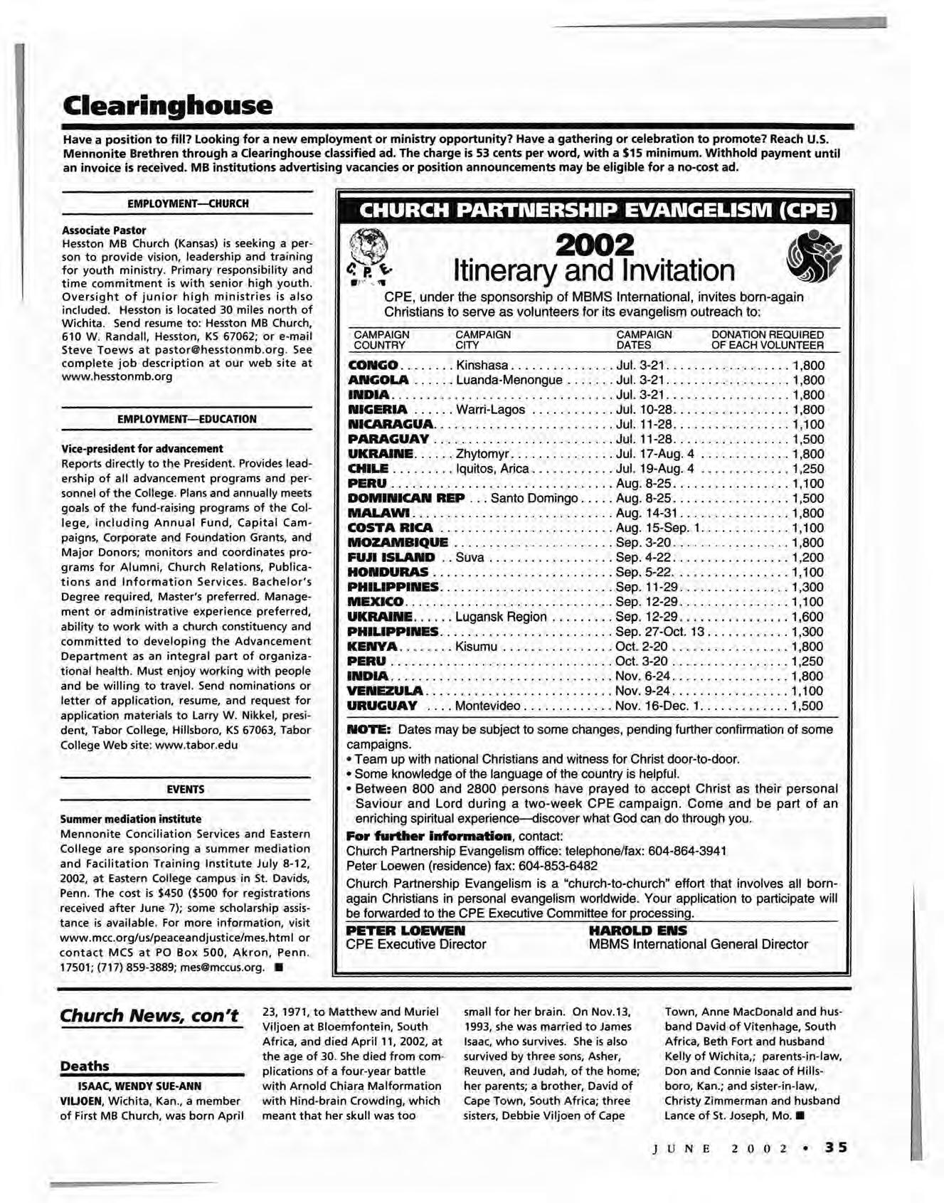 Have a position to fill? Looking for a new employment or ministry opportunity? Have a gathering or celebration to promote? Reach U.S. Mennonite Brethren through a Clearinghouse classified ad. The charge is S3 cents per word, with a $15 minimum. Withhold payment until an invoice is received. MB institutions advertising vacancies or position announcements may be eligible for a no-cost ad.
