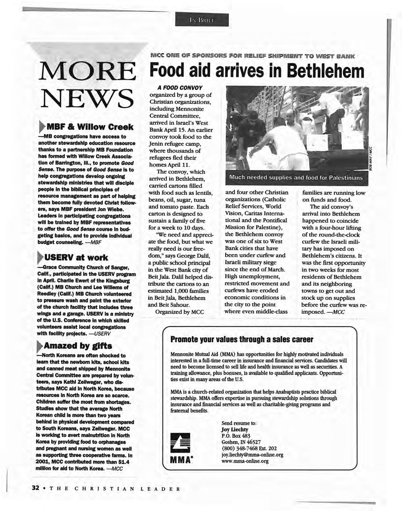 and four other Christian organizations (Catholic ReliefSennces, World Vision, Caritas International and the Pontifical Mission for Palestine), the Bethlehem convoy was one of six to West Bank cities that have been under curfew and Israeli military siege since the end of March. High unemployment, restricted movement and curfews have eroded economk conditions in the city to the point where even middle-class