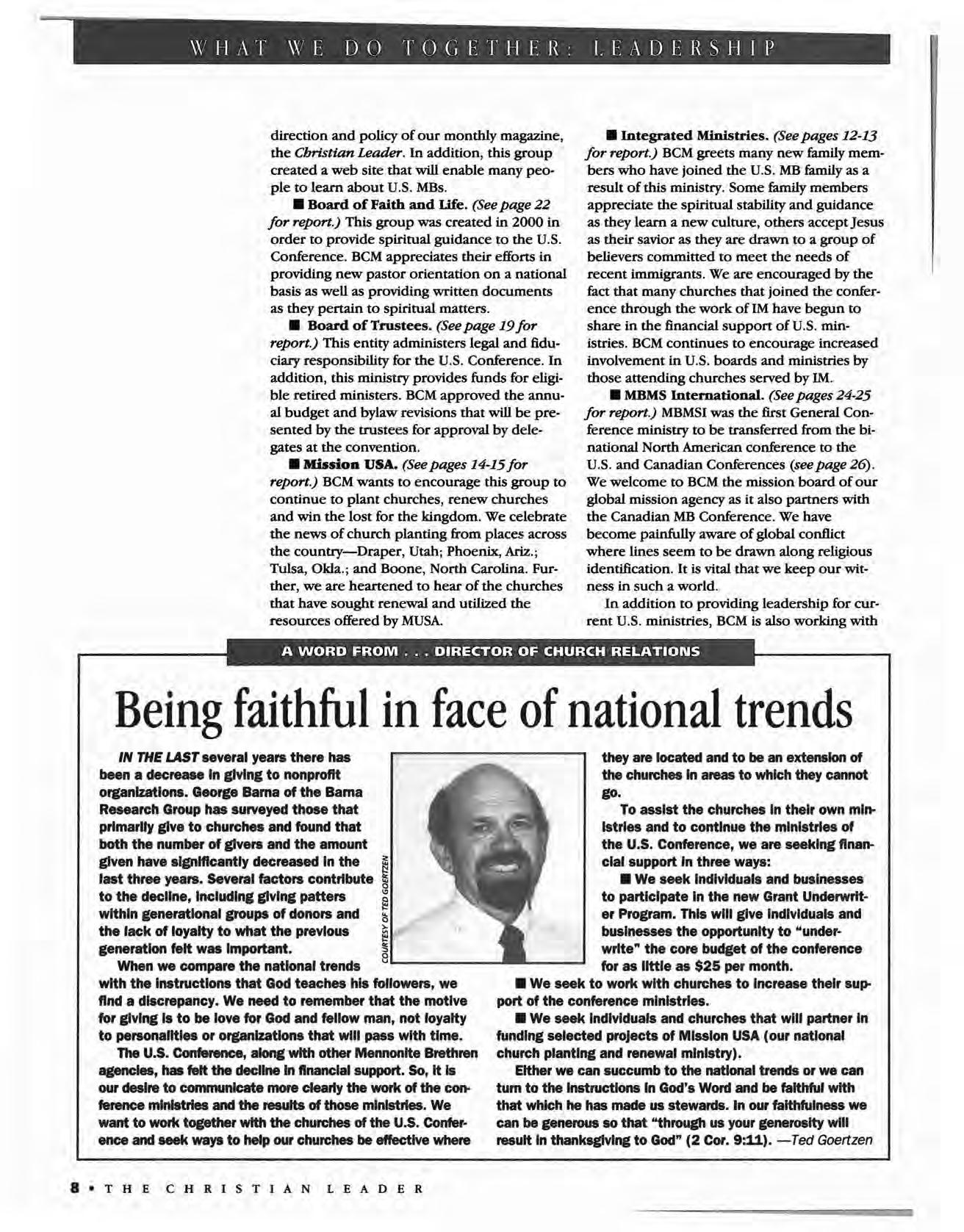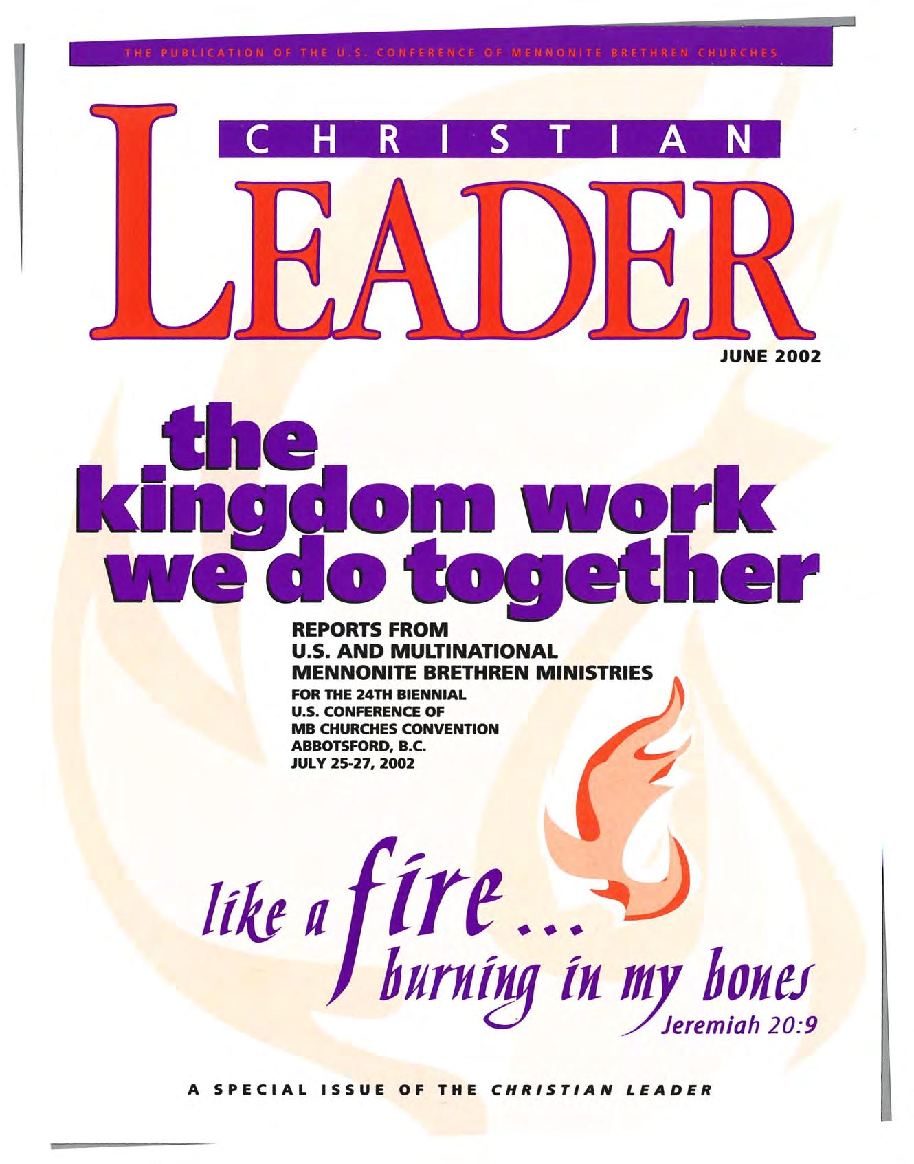 HIS IS A UNIQUE ISSUE of the Christian Leader. Instead of our normal features and news, our pages are filled with reports from our national ministries and multinational ministries with which we partner in preparation for the U.S. Conference of MB Churches convention this summer.