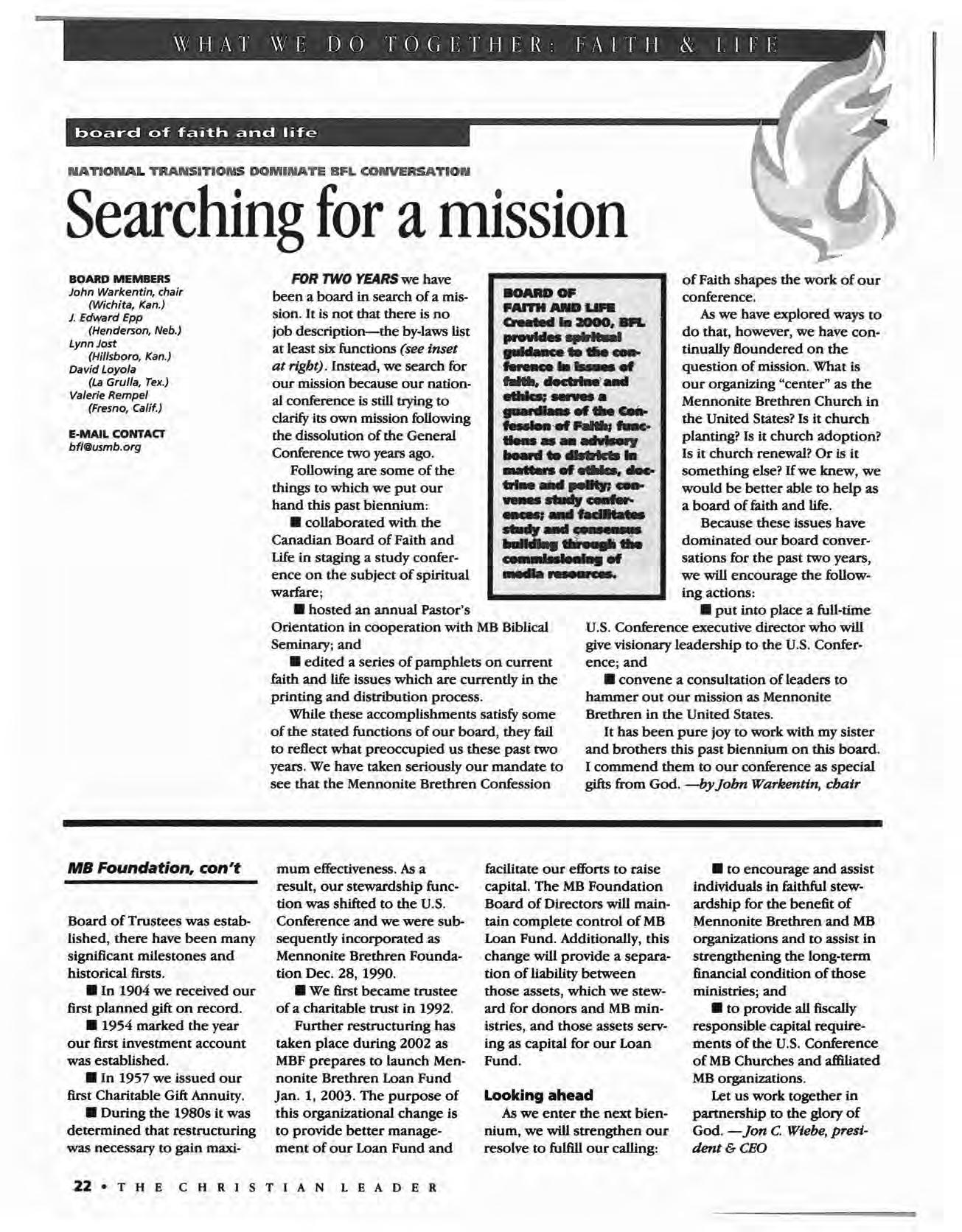 At its March meeting, leaders affirmed the importance of securing a u.S. Conference executive director. The Board of Faith and Life reissued that call in its report (see page 22). Our volunteer leaders and existing staff are simply stretched too thin to adequately meet the challenges facing us.