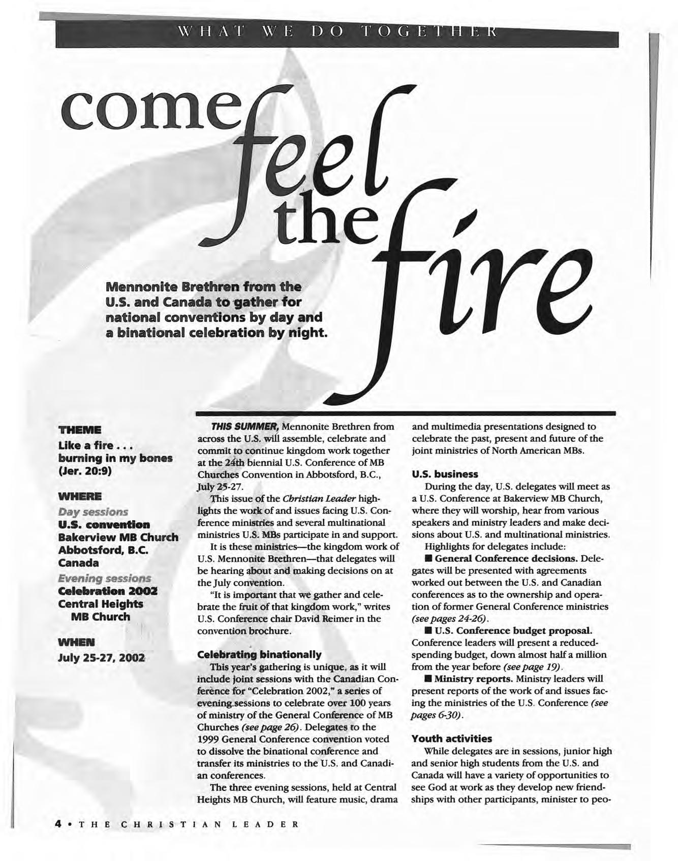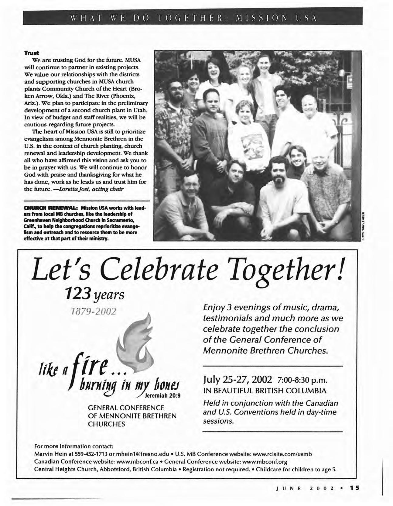 This year-'s sathedng is unique, as it will include joint sessions with the Canadian Conference rot "Celebration 2002;" a series of evening.sessions to celebrate Over 100 years of ministry of the General of MB Churches (see page 26). Delegates to the 1999 General Conference convention voted to dissolve the binational conference and transfer its ministries to the U.S. and Canadian conferences.