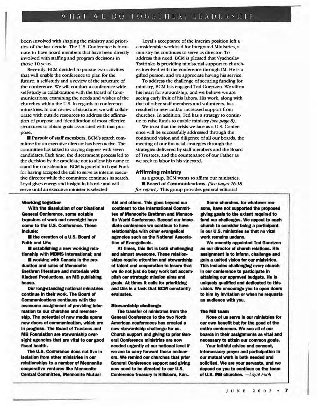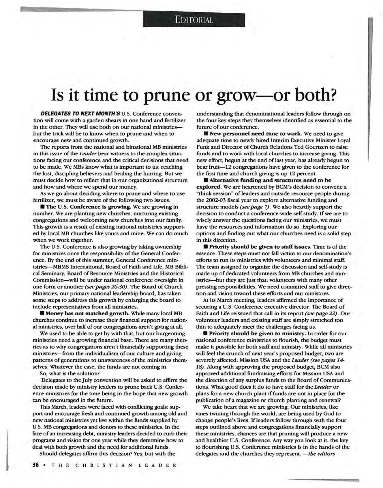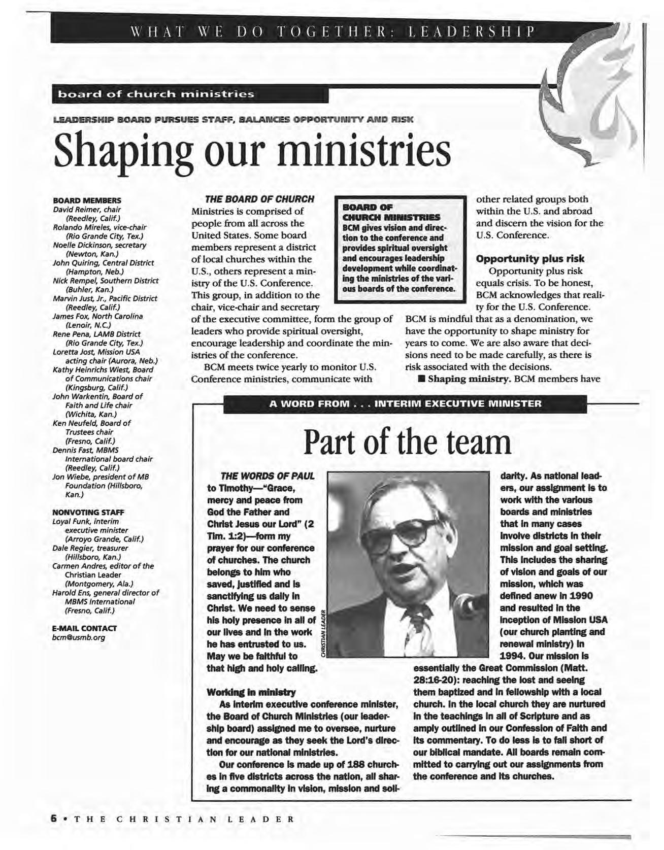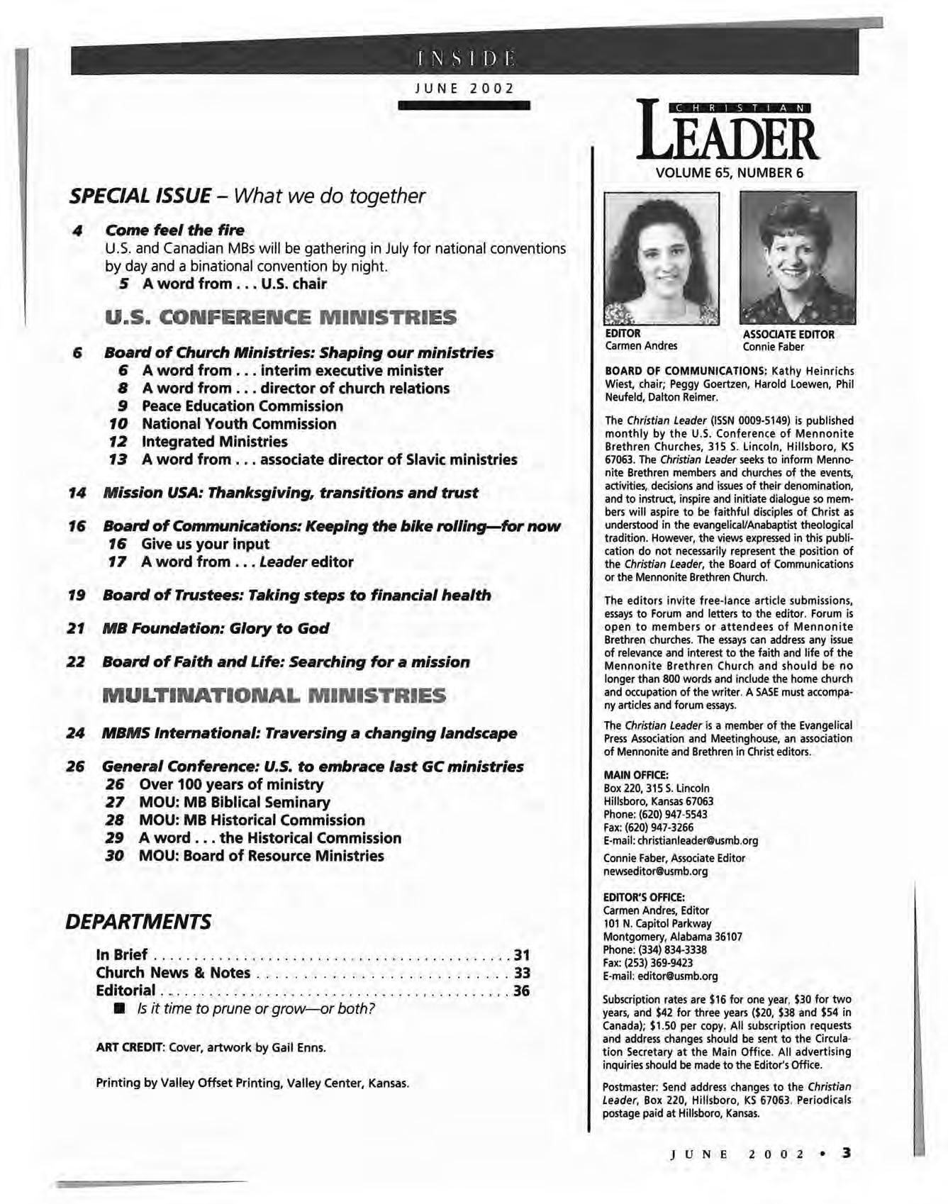 The Christian Leader (ISSN 0009-5149) is published monthly by the U.S. Conference of Mennonite Brethren Churches, 315 S. Lincoln, Hillsboro, KS 67063. The Christian Leader seeks to inform Mennonite Brethren members and churches of the events, activities, decisions and issues of their denomination, and to instruct, inspire and initiate dialogue so members will aspire to be faithful disciples of Christ as understood in the evangelicaVAnabaptist theological tradition. However, the views expressed in this publication do not necessarily represent the position of the Christian Leader, the Board of Communications or the Mennonite Brethren Church.
