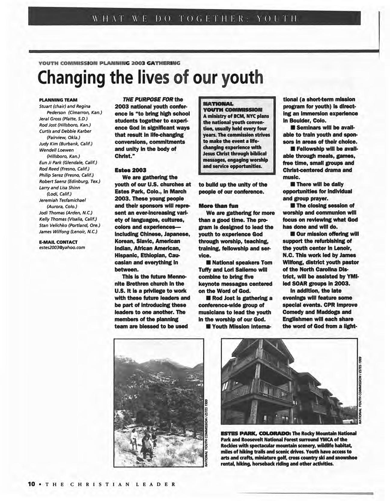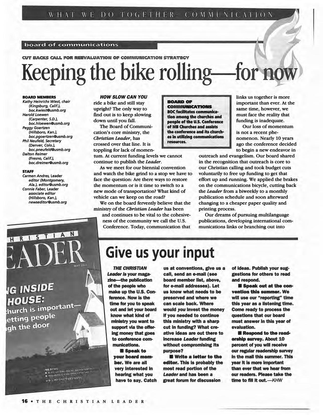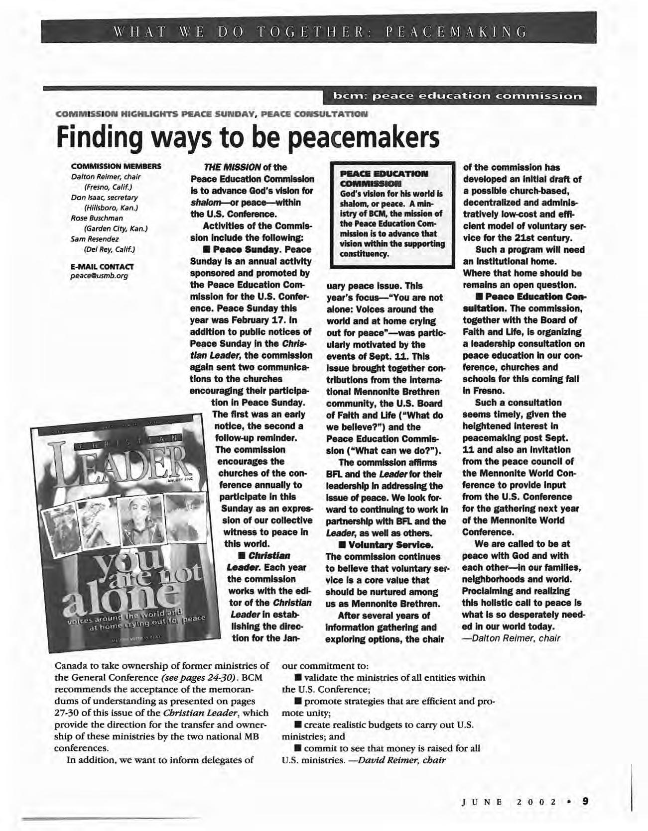 The Christian Leader (ISSN 0009-5149) is published monthly by the U.S. Conference of Mennonite Brethren Churches, 315 S. Lincoln, Hillsboro, KS 67063. The Christian Leader seeks to inform Mennonite Brethren members and churches of the events, activities, decisions and issues of their denomination, and to instruct, inspire and initiate dialogue so members will aspire to be faithful disciples of Christ as understood in the evangelicaVAnabaptist theological tradition. However, the views expressed in this publication do not necessarily represent the position of the Christian Leader, the Board of Communications or the Mennonite Brethren Church.