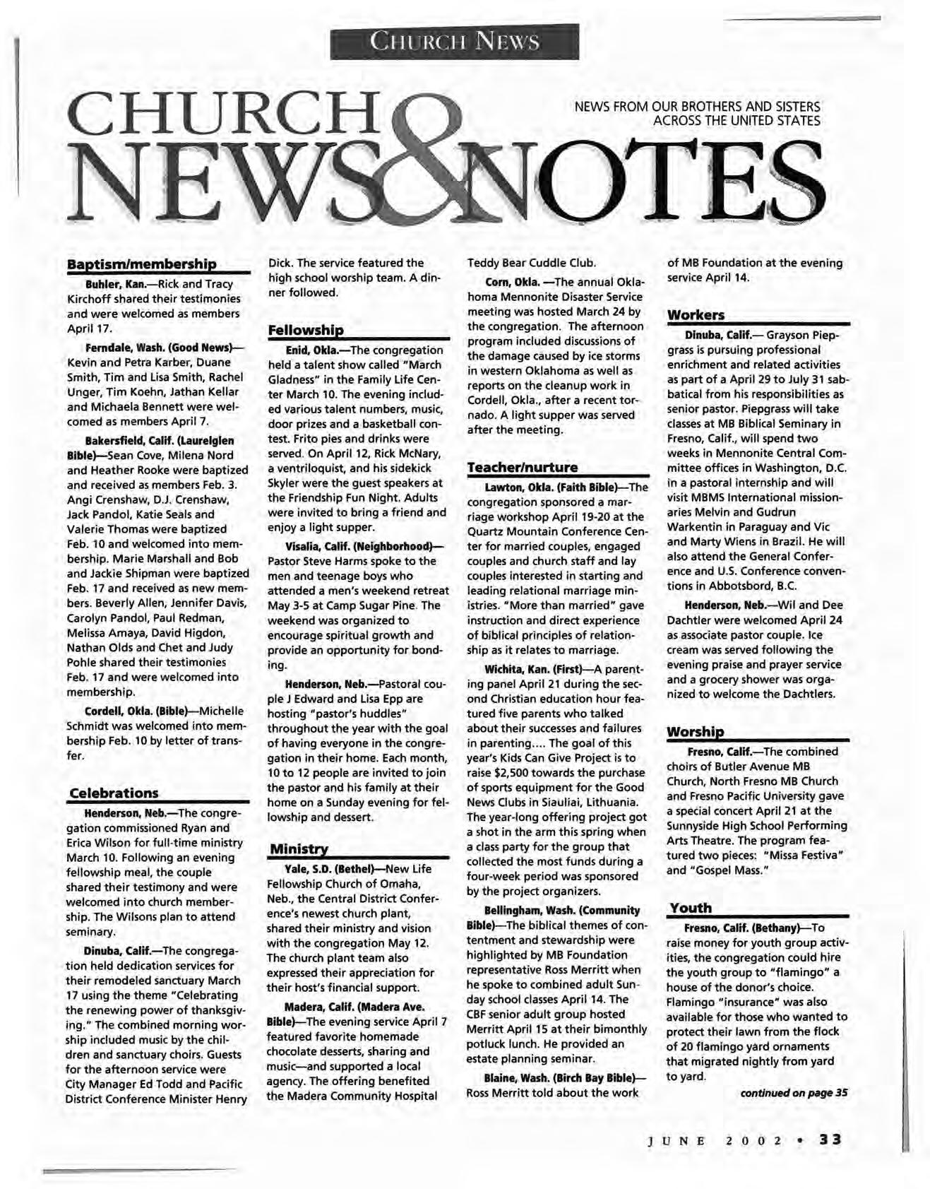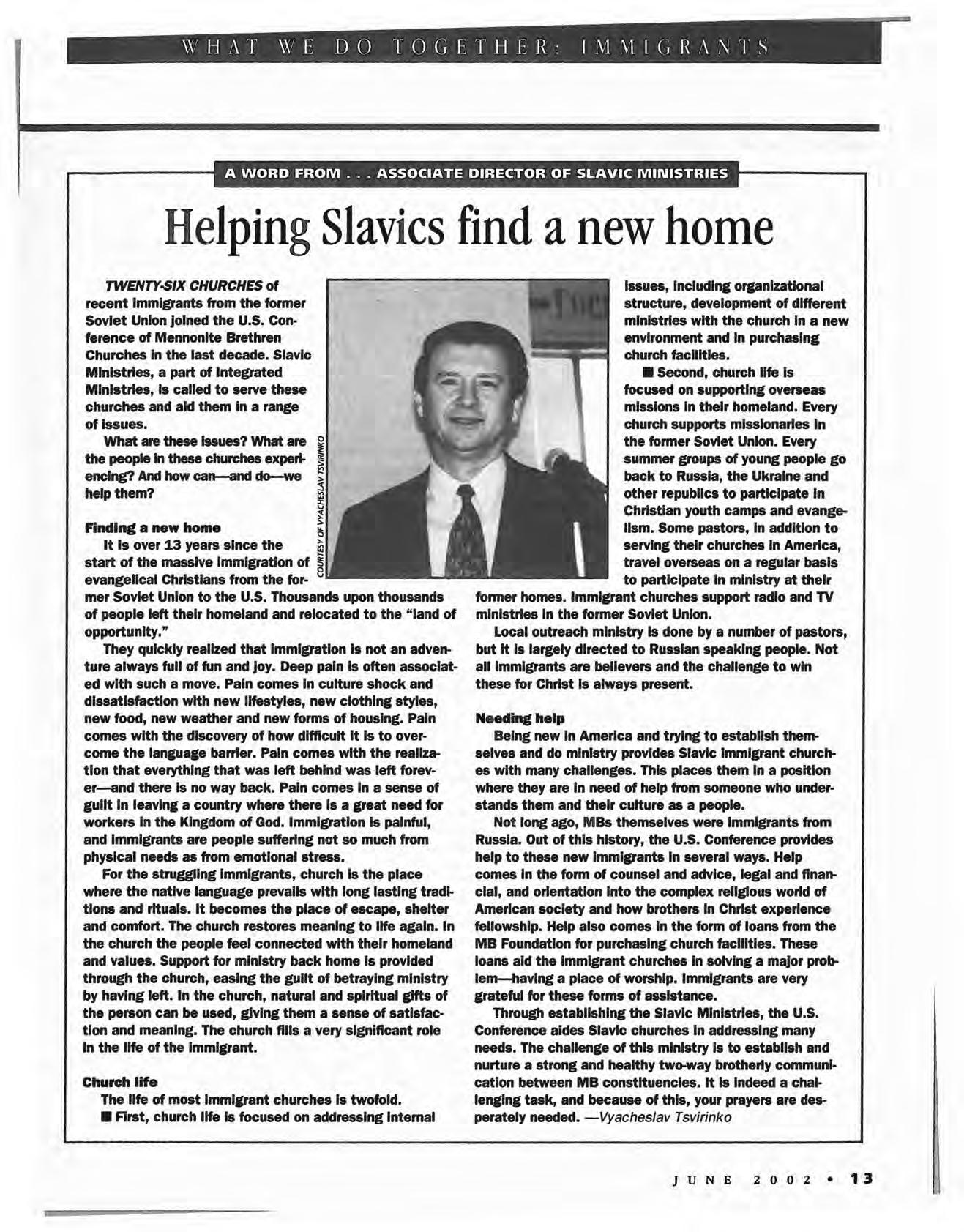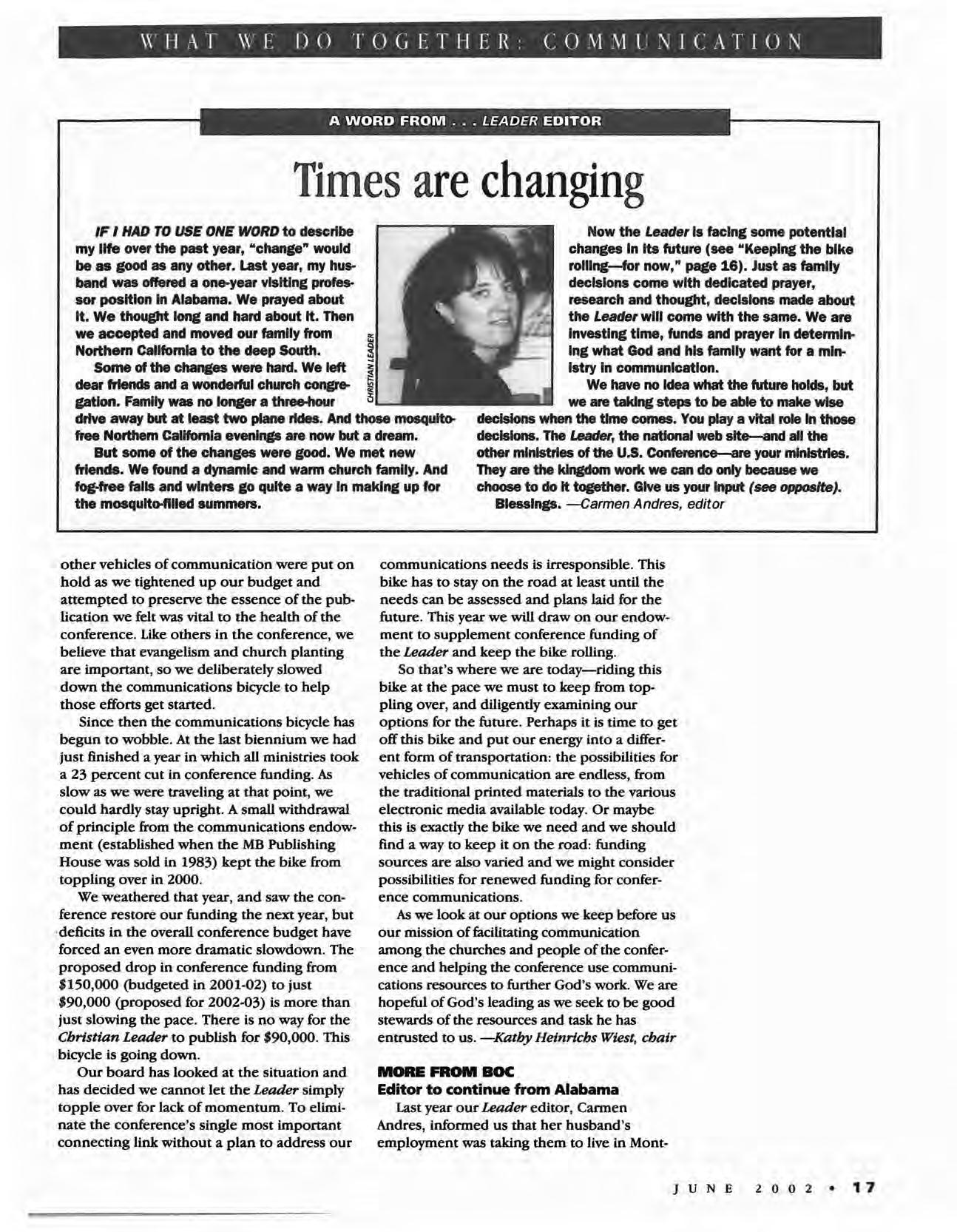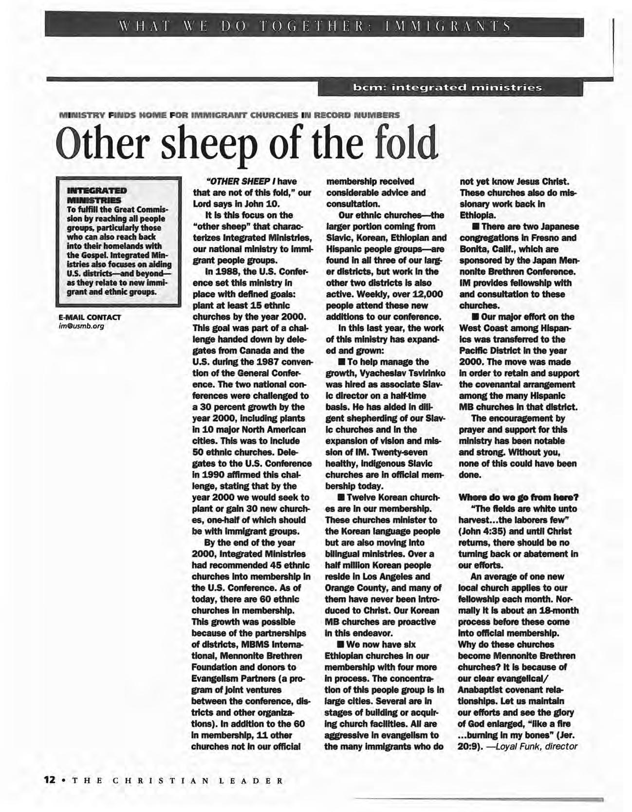 The Christian Leader (ISSN 0009-5149) is published monthly by the U.S. Conference of Mennonite Brethren Churches, 315 S. Lincoln, Hillsboro, KS 67063. The Christian Leader seeks to inform Mennonite Brethren members and churches of the events, activities, decisions and issues of their denomination, and to instruct, inspire and initiate dialogue so members will aspire to be faithful disciples of Christ as understood in the evangelicaVAnabaptist theological tradition. However, the views expressed in this publication do not necessarily represent the position of the Christian Leader, the Board of Communications or the Mennonite Brethren Church.