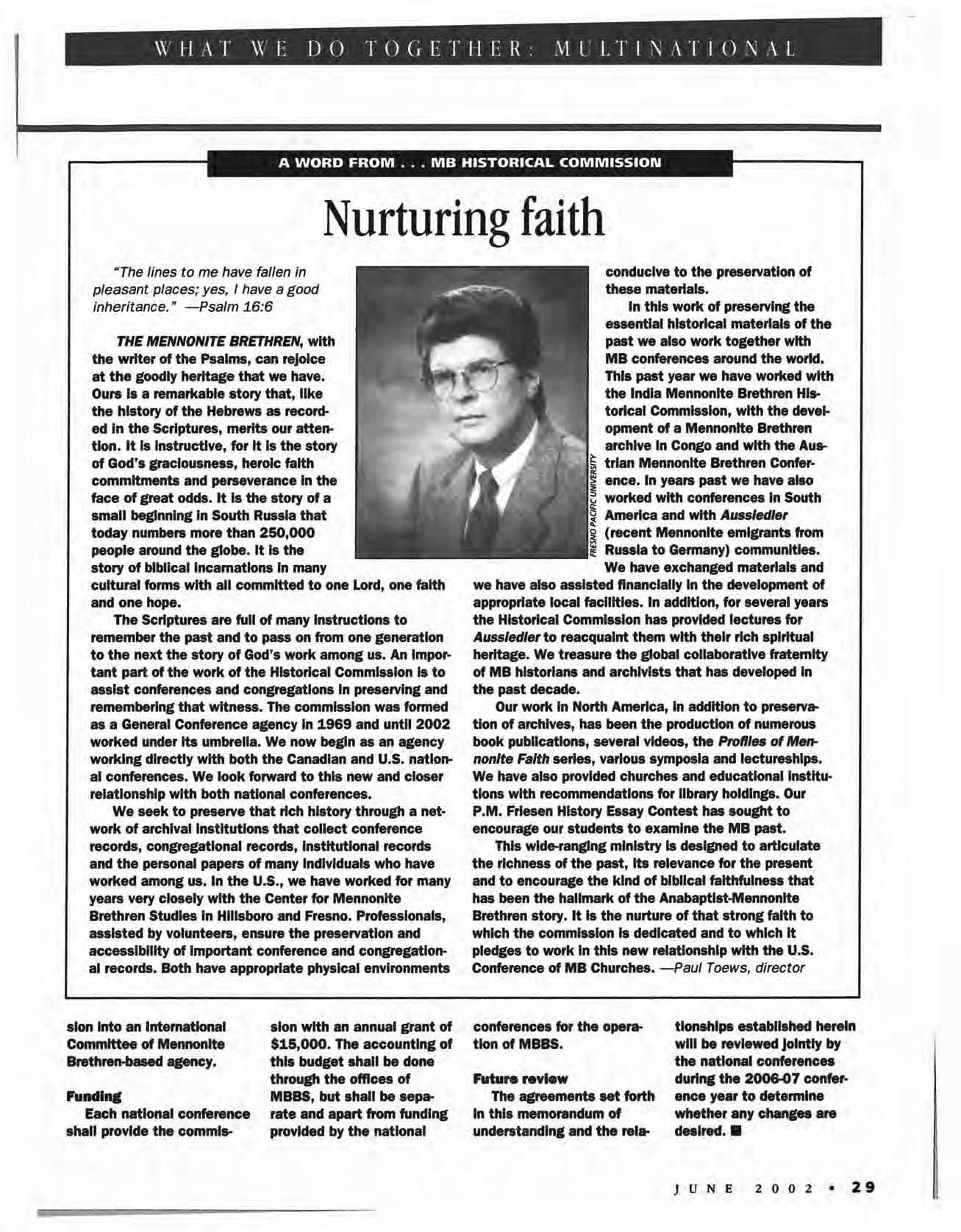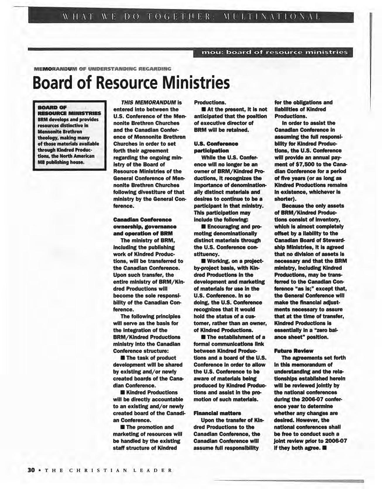 The u.S. Conference is also growing by taking ownership for ministries once the responsibility of the General Conference. By the end of this summer, General Conference ministries-MBMS International, Board of Faith and Life, MB Biblical Seminary, Board of Resource Ministries and the Historical Commission-will be under national conference oversight in one form or another (see pages 26-30). The Board of Church Ministries, our primary national leadership board, has taken some steps to address this growth by enlarging the board to include representatives from all ministries.