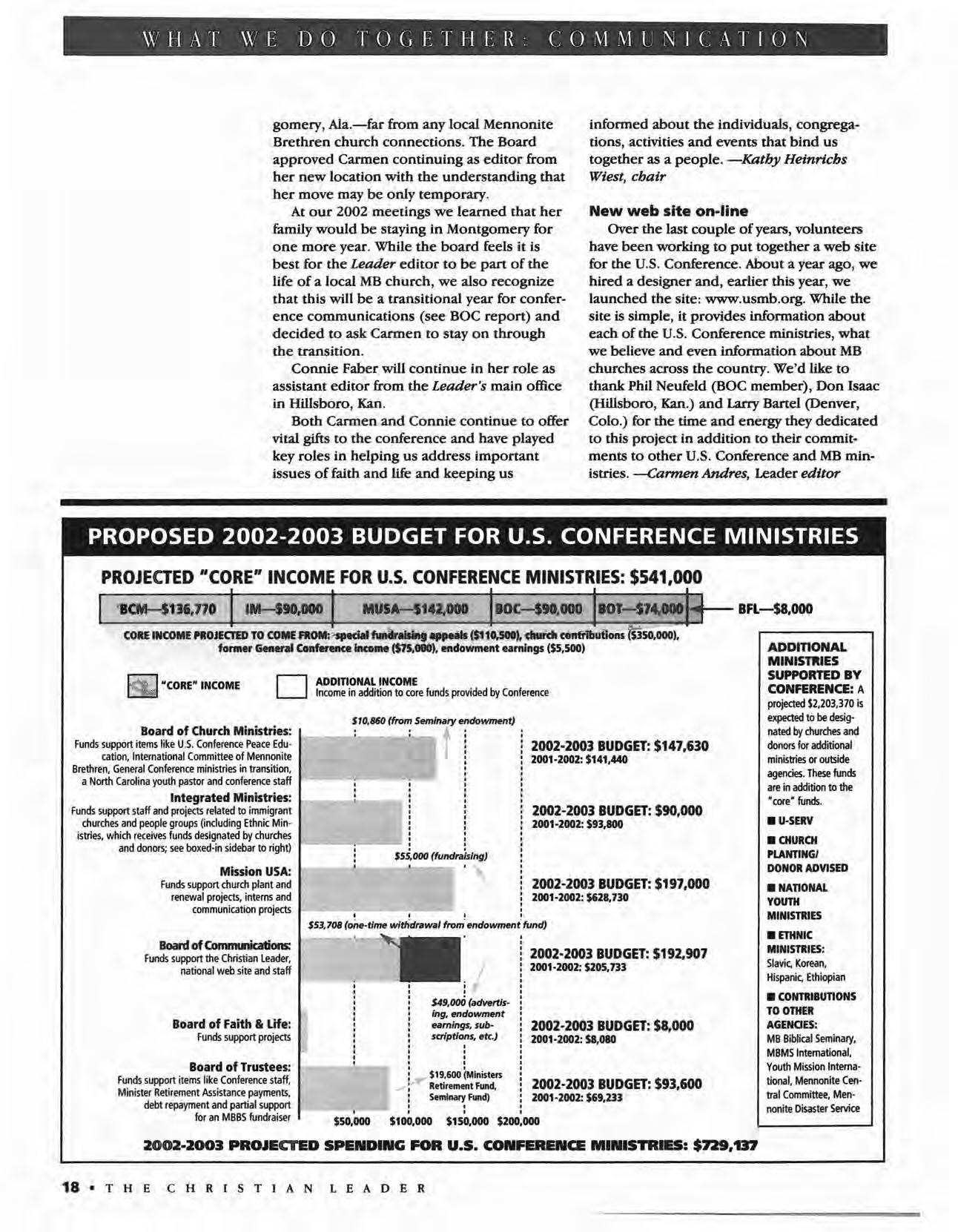 • Priority should be given to ministry. In order for our national conference ministries to flOUrish, the budget must make it possible for both staff and ministry. While all ministries will feel the crunch of next year's proposed budget, two are severely affected: Mission USA and the Leader (see pages 1418). Along with approving the proposed budget, BCM also approved additional fundraising efforts for Mission USA and the direction of any surplus funds to the Board of Communications. What good does it do to have staff for the Leader or plans for a new church plant if funds are not in place for the publication of a magazine or church planting and renewal?