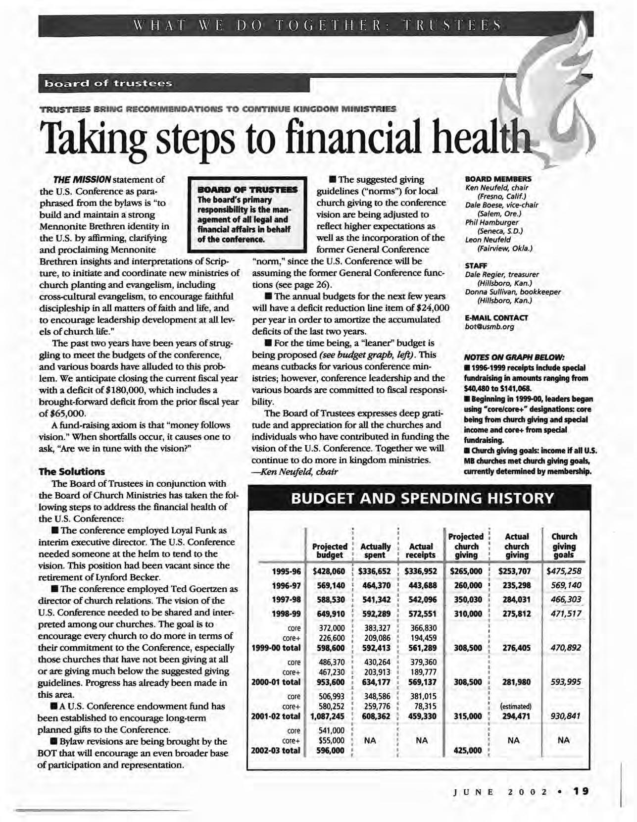 • New personnel need time to work. We need to give adequate time to newly hired Interim Executive Minister Loyal Funk and Director of Church Relations Ted Goertzen to raise funds and to work with local churches to increase giving. This new effort, begun at the end of last year, has already begun to bear fruit-12 congregations have given to the conference for the first time and church giving is up 12 percent.