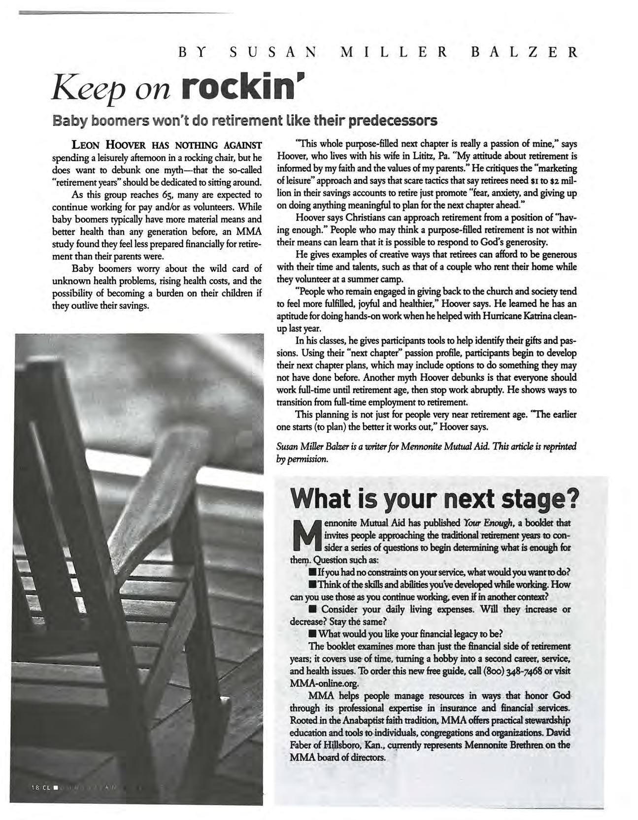 Research suggests that baby boomers won't do retirement like their predecessors. Many will continue working or volunteering past the age of 65. They will also feel less prepared financially for retirement than their parents were. One stewardship educator says that living with purpose and viewing retirement as the next chapter in life can help Christians approach retirement with a healthy attitude.