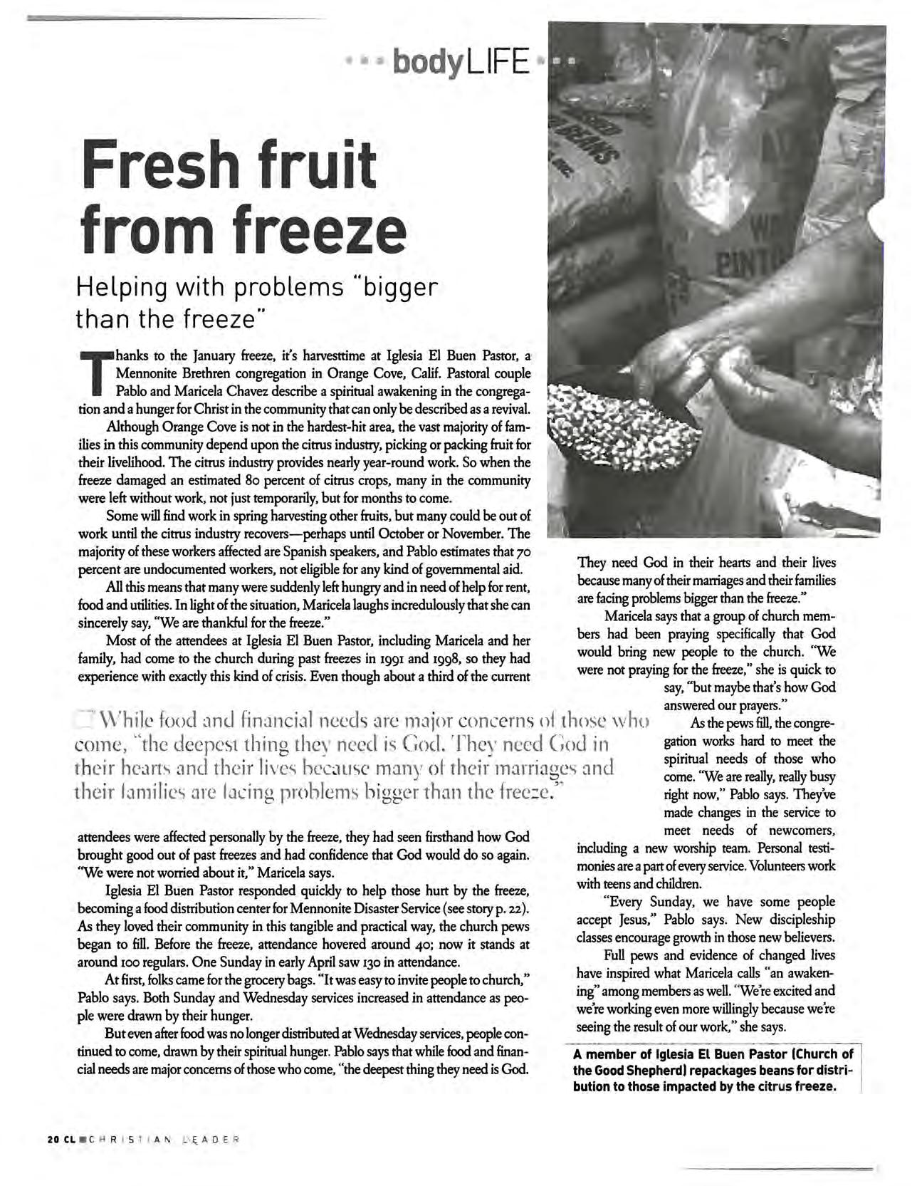 With this truth in mind, our news section this month focuses on Central California and the ongoing efforts of Mennonite Brethren congregations and inter-Mennonite agencies to aid the hundreds of households impacted by the January citrus freeze. Many of us don't think much about the freeze anymore, except maybe when we buy a gallon of orange juice and grumble about the price. The freeze may be old news for us but for residents and businesses in the 21 counties declared disaster areas, the story continues to unfold. Thanks to assistant editor Myra Holmes who coordinated the Leader's coverage of the January freeze. Her special report reveals that this crisis is not over and highlights the way in which a natural disaster has produced spiritual fruit.-CF