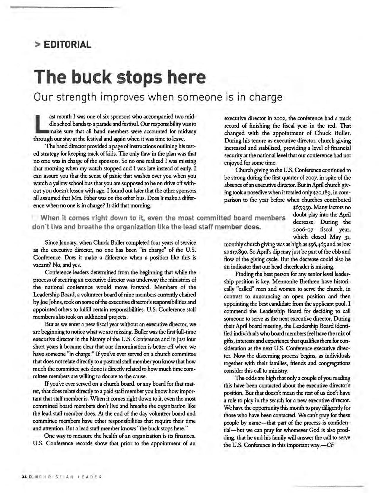 But as we enter a new fiscal year without an executive director, we are beginning to notice what we are missing. Buller was the first full-time executive director in the history of the U.S. Conference and in just four shon years it became clear that our denomination is better off when we have someone "in charge." If you've ever served on a church committee that does not relate directly to a pastotal staff member you know that how much the committee gets done is directly related to how much time committee members are willing to donate to the cause.