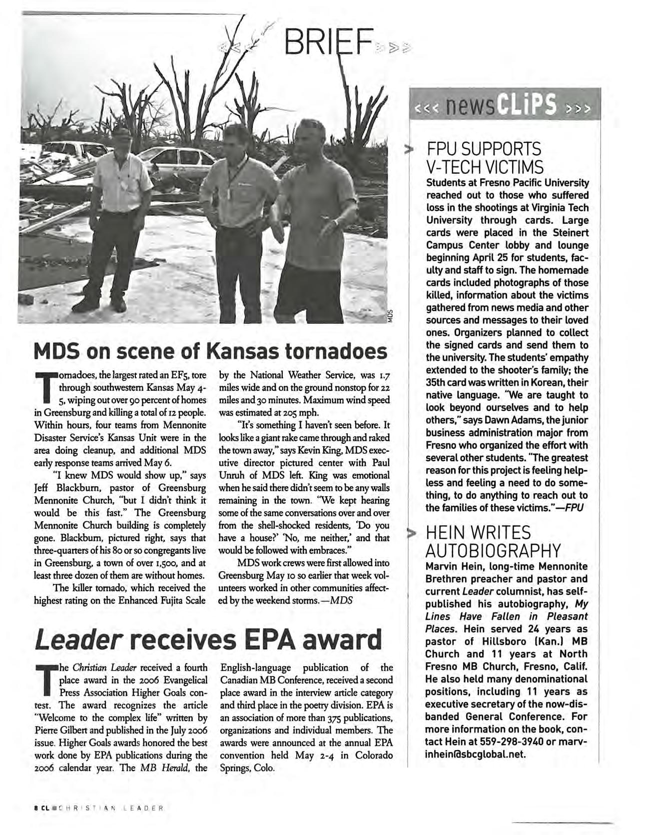 Wich ita, Kan. (Firstl-Deacons opened a fund for victims of the Greensburg, Kan., tornado. The church encouraged people to volunteer to help with food distribution and tornado cleanup through the Salvation Army and Mennonite Disaster Service