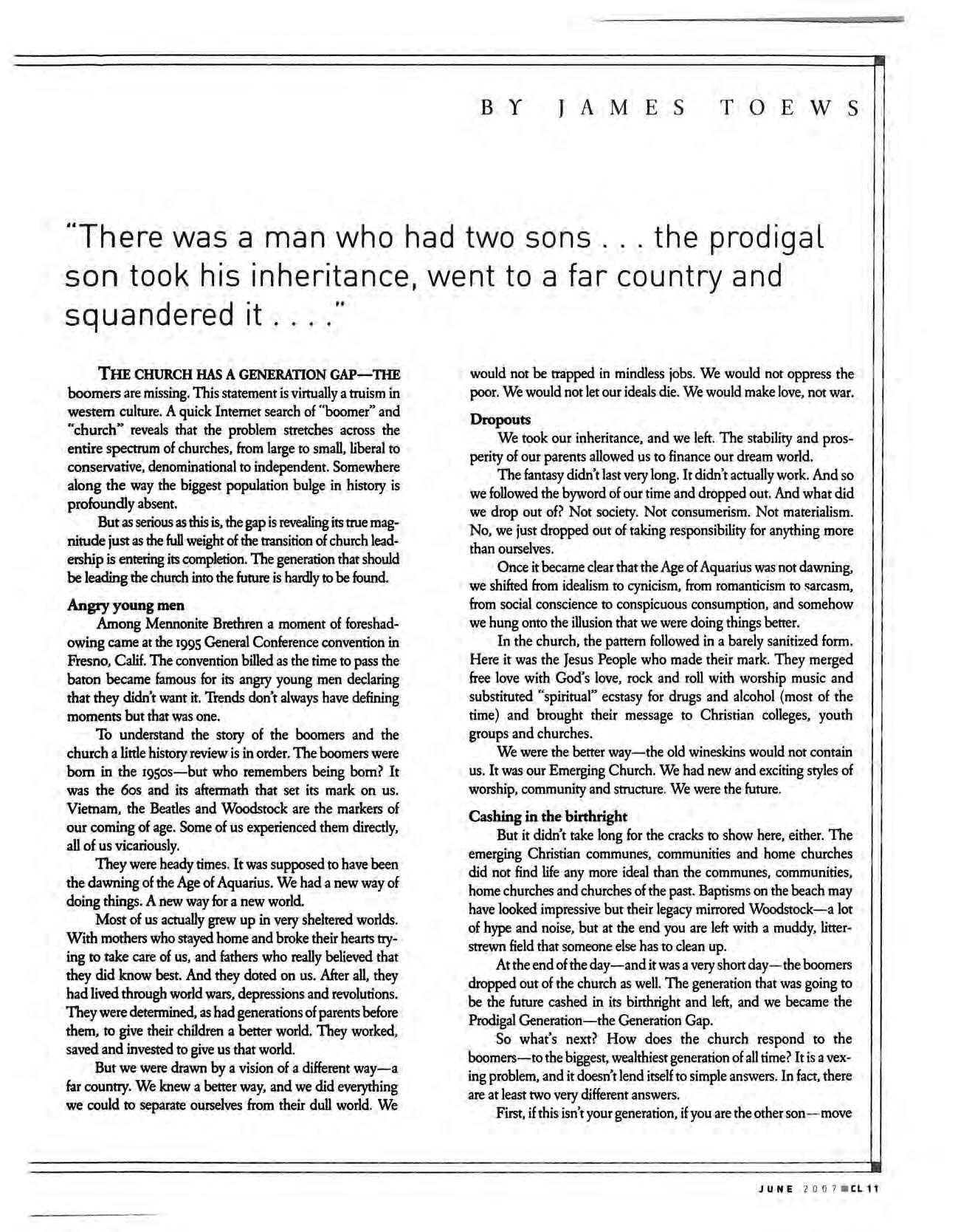There is a generation gap in the church today-the boomers are missing . Baby boomers should be leading the church into the future but this generation is hardly to be found in the church today. But now the time has come. According to the ancient pattern of generations, we have an obligation to give something to the next generation.