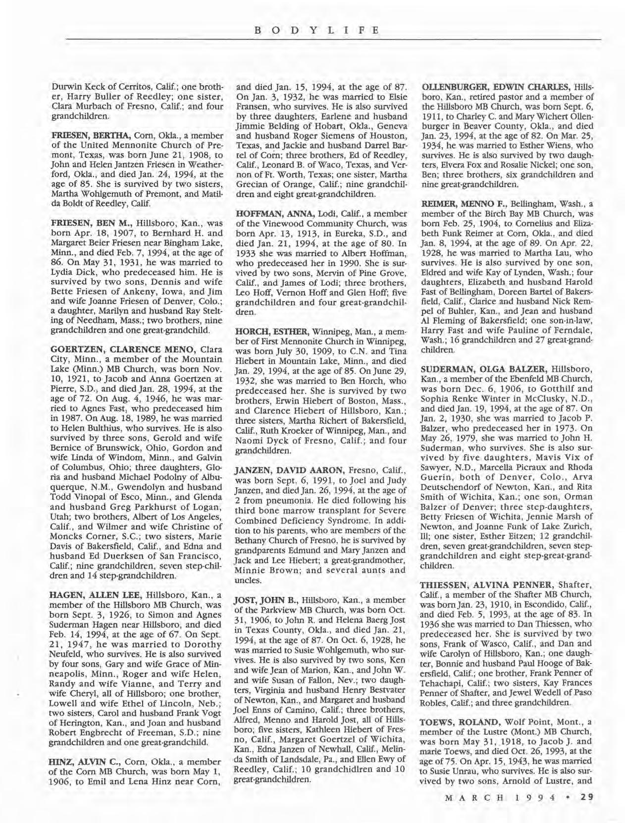 and died Jan. 15, 1994, at the age of 87. On Jan. 3, 1932, he was married to Elsie Fransen, who survives. He is also survived by three daughters, Earlene and husband Jimmie Belding of Hobart, Okla., Geneva and husband Roger Siemens of Houston, Texas, and Jackie and husband Darrel Bartel of Coin; three brothers, Ed of Reedley, Calif., Leonard B. of Waco, Texas, and Vernon of Ft. Worth, Texas; one sister, Martha Grecian of Orange, Calif.; nine grandchildren and eight great-grandchildren.