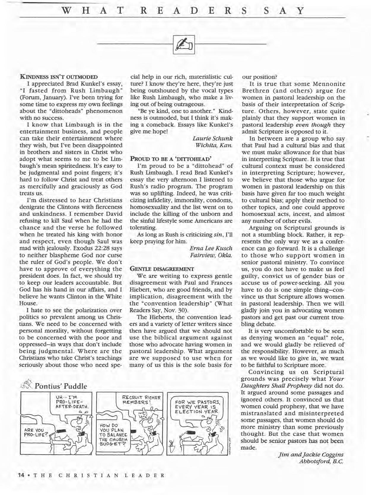 MANDATE: THE CHRISTIAN LEADER (ISSN 00095149), organ of the U.S. Conference of Mennonite Brethren Churches, is published monthly by the U.S. Conference Board of Communications, 315 S. Lincoln, Hillsboro, KS 67063. The Christian Leader seeks to inform Mennonite Brethren members and churches of the events, activities, decisions, and issues of their denomination, and to instruct, inspire and initiate dialog so that they will aspire to be faithful disciples of Christ as understood in the evangelicalj Anabaptist theological tradition.