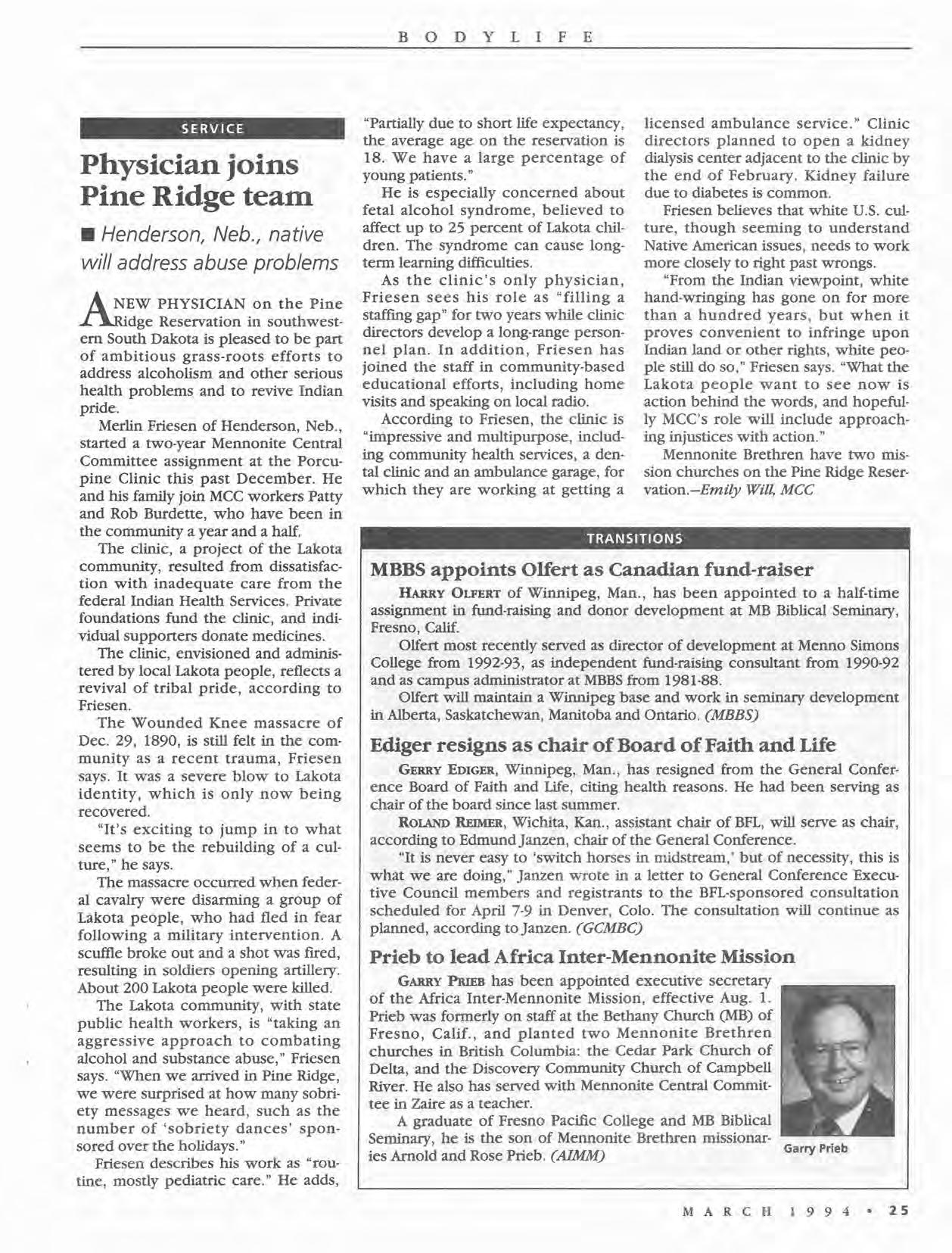A graduate of Fresno Pacific College and MB Biblical Seminary, he is the son of Mennonite Brethren missionaries Arnold and Rose Priebe (AIMM) Garry Prieb