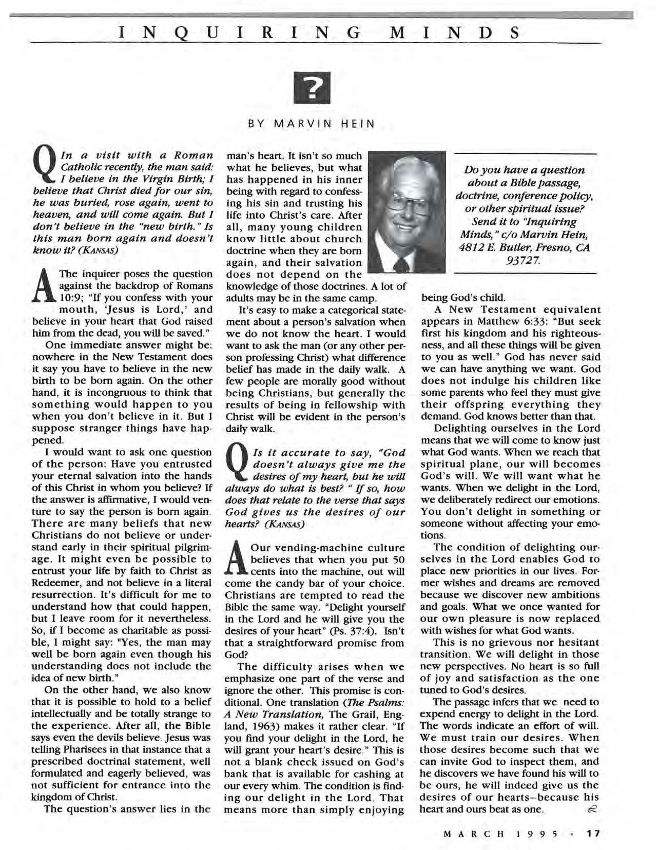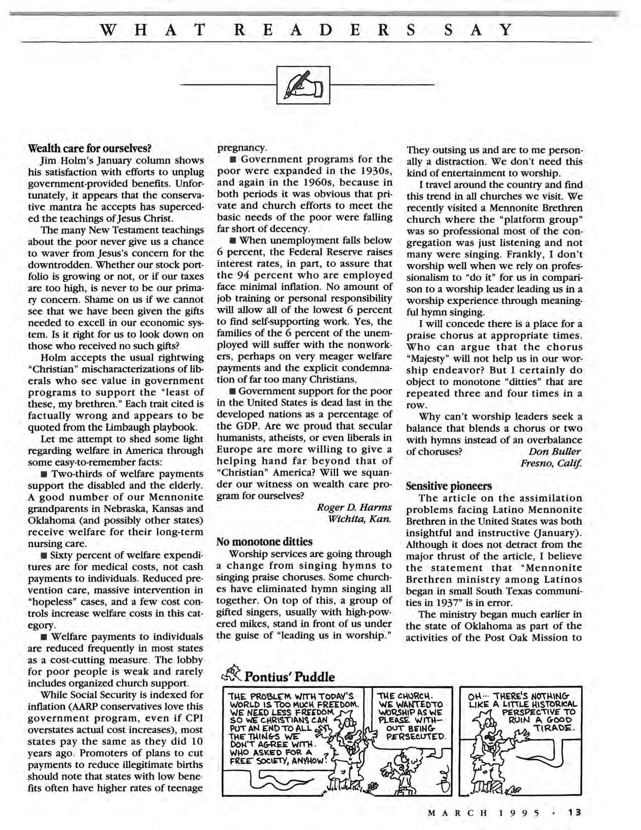 Readers again have an opportunity to respond to issues of faith and life. Look for a topic in each of the next few issues. We value your response . We build the church together in this way. -KFW