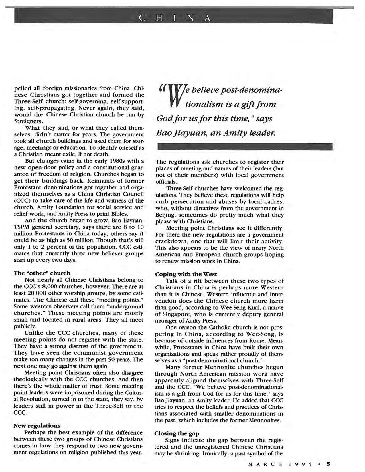 Many former Mennonite churches begun through North American mission work have apparently aligned themselves with Three-Self and the CCc. "We believe post-denominationalism is a gift from God for us for this time, " says Bao ]iayuan, an Amity leader. He added that CCC tries to respect the beliefs and practices of Christians associated with smaller denominations in the past , which includes the former Mennonites