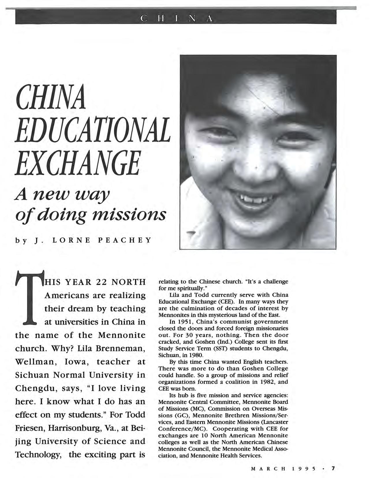 THE CHRISTIAN WITNESS in one of the largest countries in the world has not been eradicated despite years of communist rule J Lorne Peachey describes the two main types of churches in China and the indirect but influential witness of teachers working there under China Educational Exchange, an inter-Mennonite organization sending teachers to China and bringing Chinese educators to North American Mennonite schools. Will the doors into China open even more?