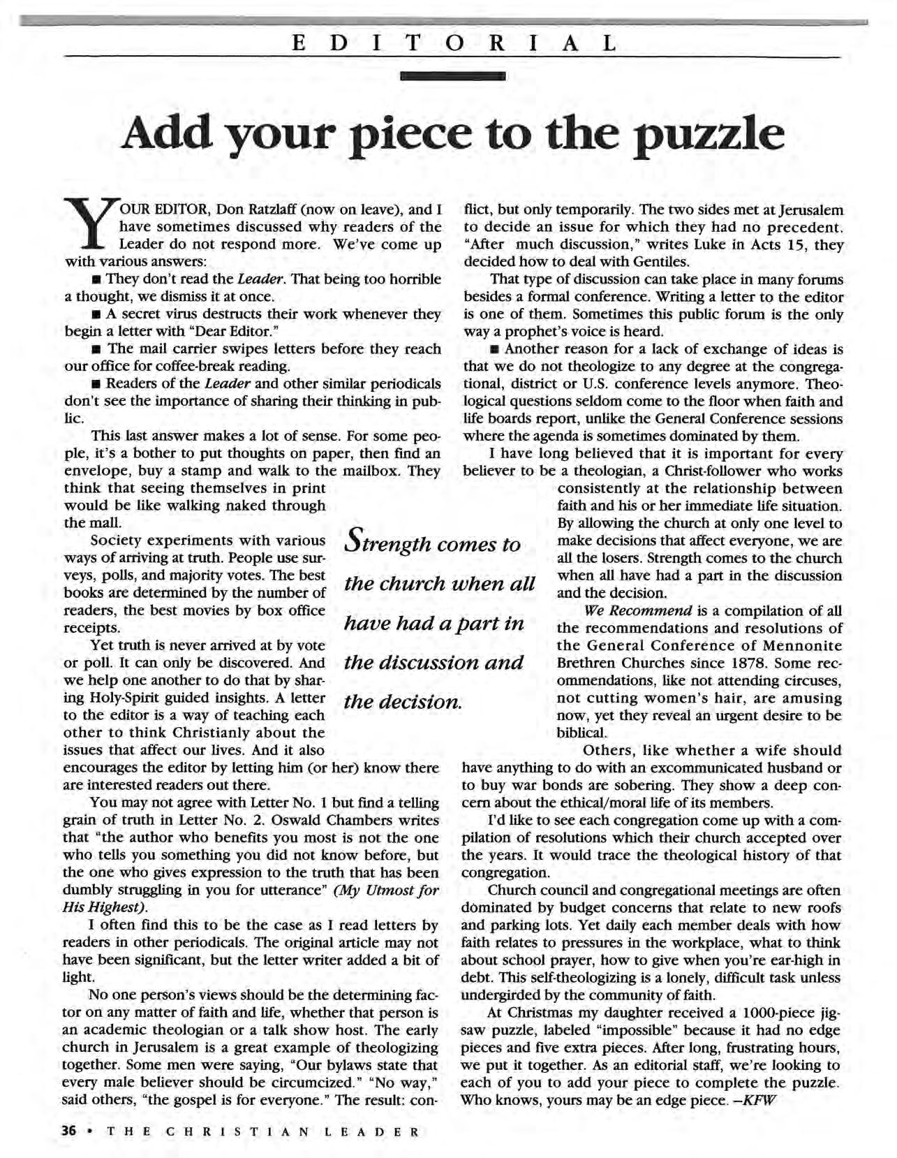 At Christmas my daughter received a lOOO-piece jigsaw puzzle, labeled "impossible" because it had no edge pieces and five extra pieces. After long, frustrating hours, we put it together. As an editorial staff, we're looking to each of you to add your piece to complete the puzzle. Who knows, yours may be an edge piece. -KFW