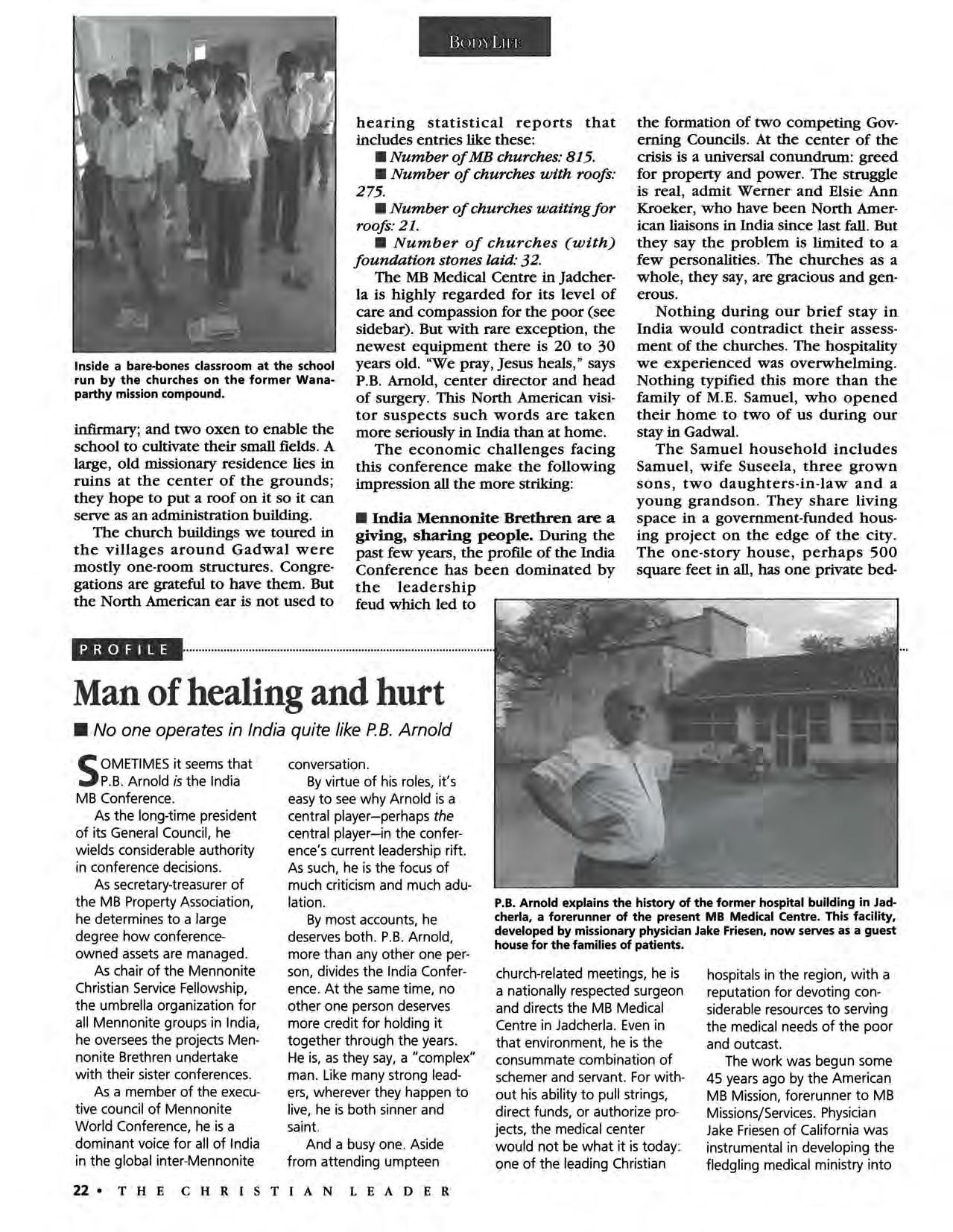 Beyond the India material, though, a couple of other significant stories arose this past month. They involve the Esengo tour, the havoc of a hard winter, a key appointment at MB Biblical Seminary, and the death of a veteran conference leader. You'll also be interested to read about the significant medical career of overseas workers Herb and Ruth Friesen.