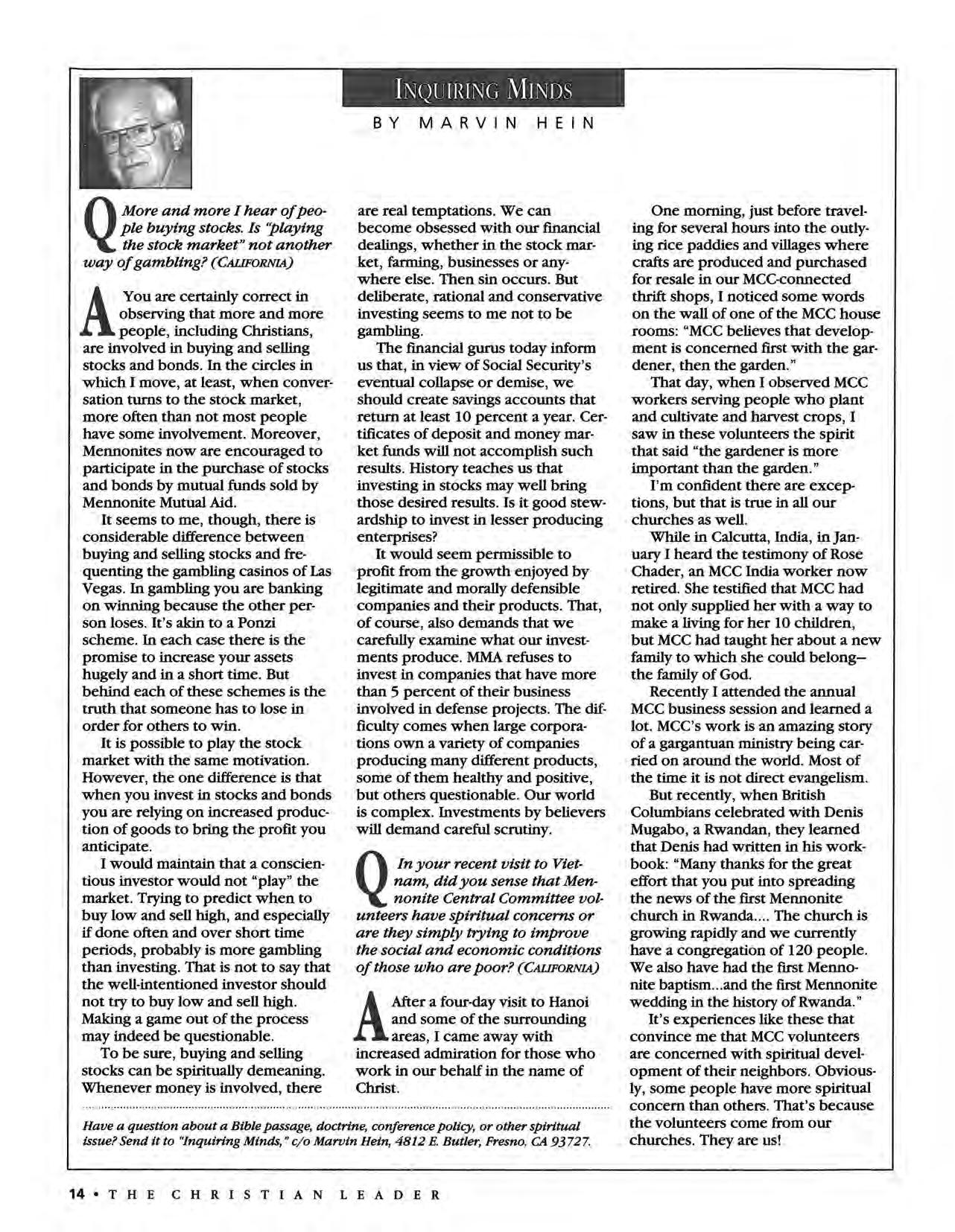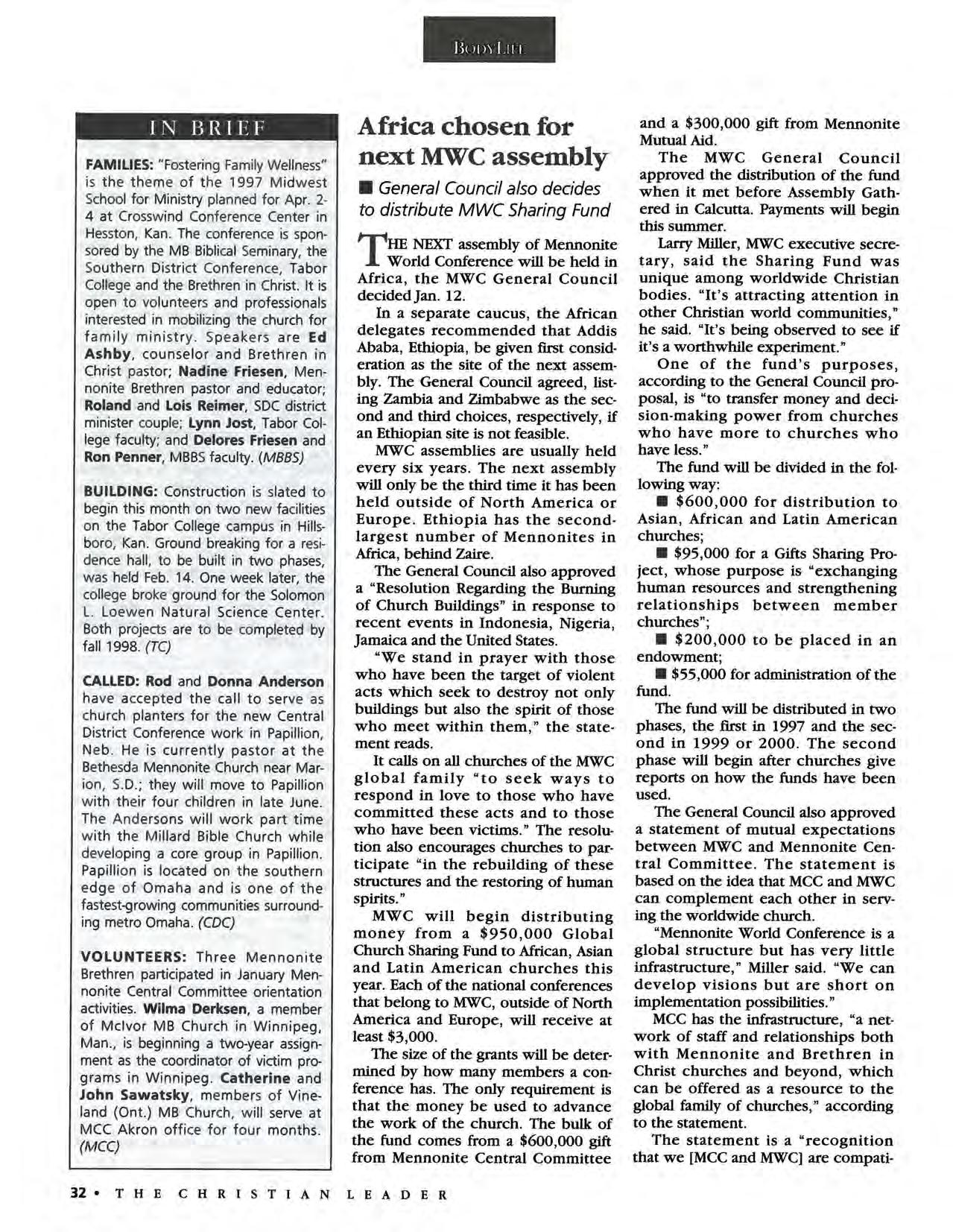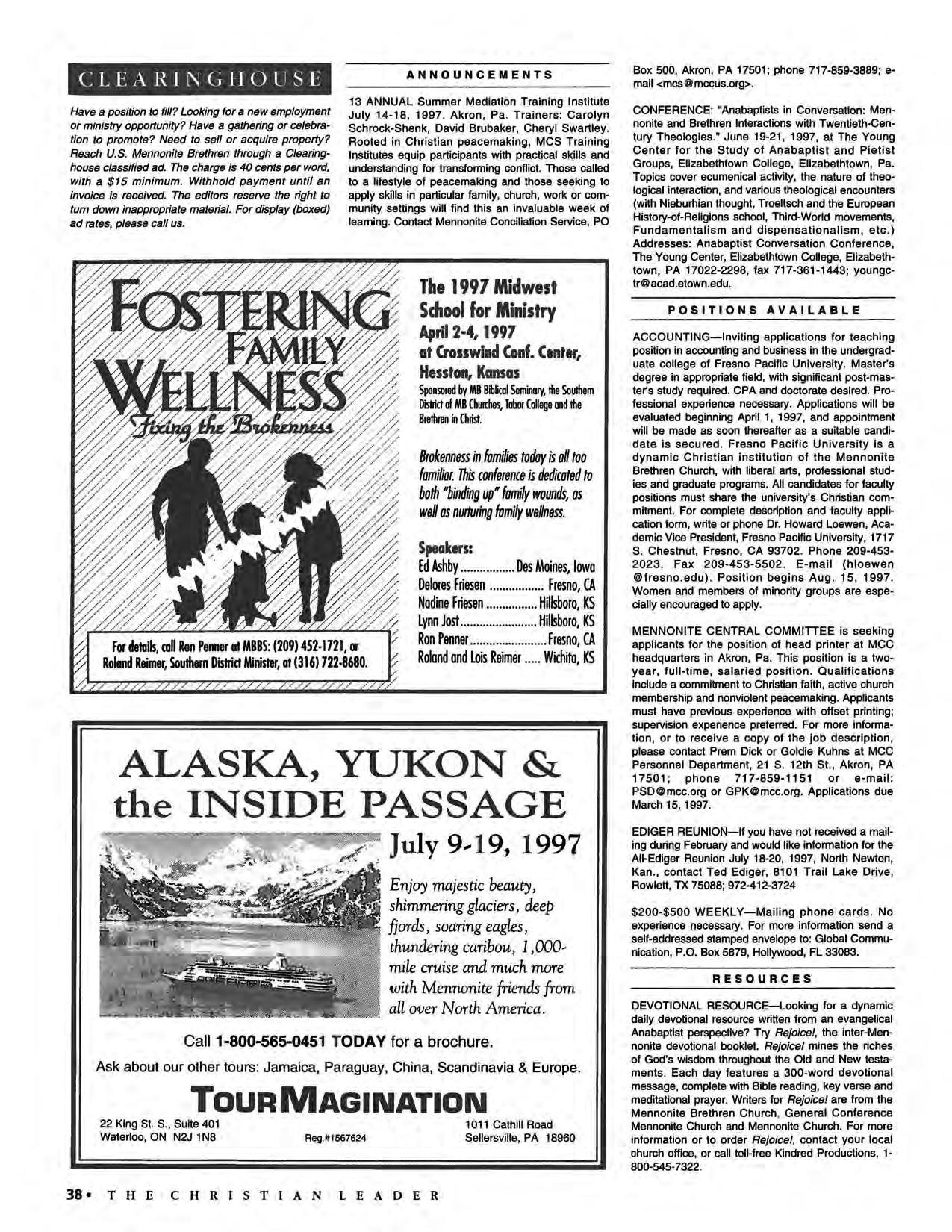 EDITORIAL POLICY: The views and opinions of our writers and advertisers are their own and do not necessarily represent the position of the Christian Leader, the Board of Communications or the Mennonite Brethren Church. The editors invite free-lance article submissions, but ask that each submission be accompanied with a SASE The editors reserve the right to edit, condense or refuse all copy submitted for publication; anonymous contributions will not be published.