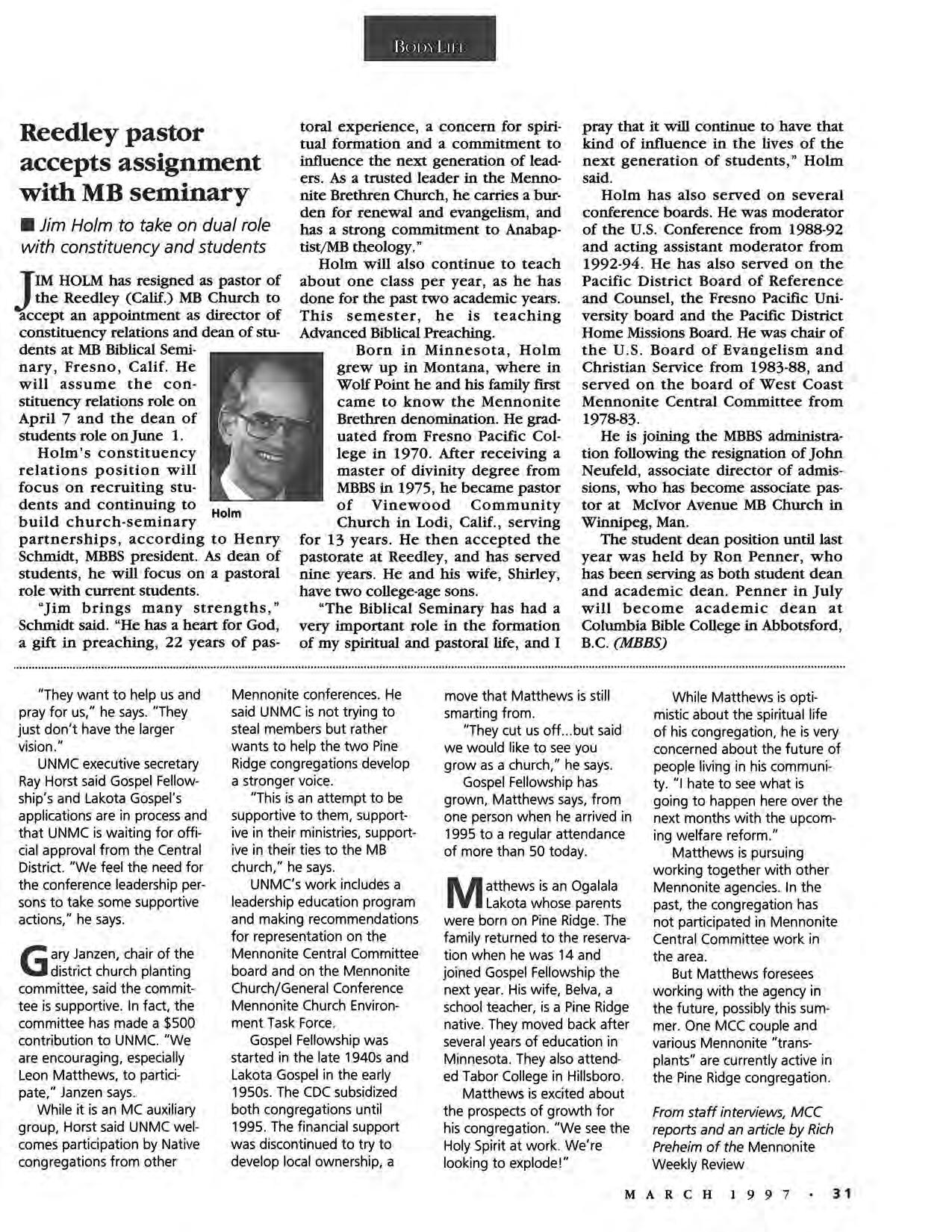 MANDATE: THE CHRISTIAN LEADER (ISSN 00095149), organ of the U S. Conference of Mennonite Brethren Churches, is published monthly by the U.S Conference Board of Communications, 315 S. Lincoln, Hillsboro, KS 67063 The Christian Leader seeks to inform Mennonite Brethren members and churches of the events, activities , decisions, and issues of their denomination, and to instruct, inspire and initiate dialog so that they will aspire to be faithful disciples of Christ as understood in the evangelical! Anabaptist theological tradition.