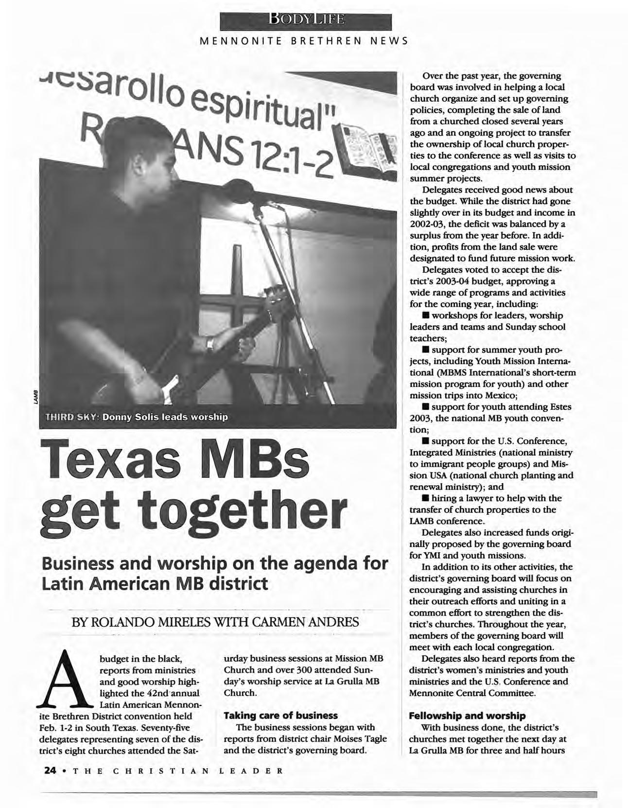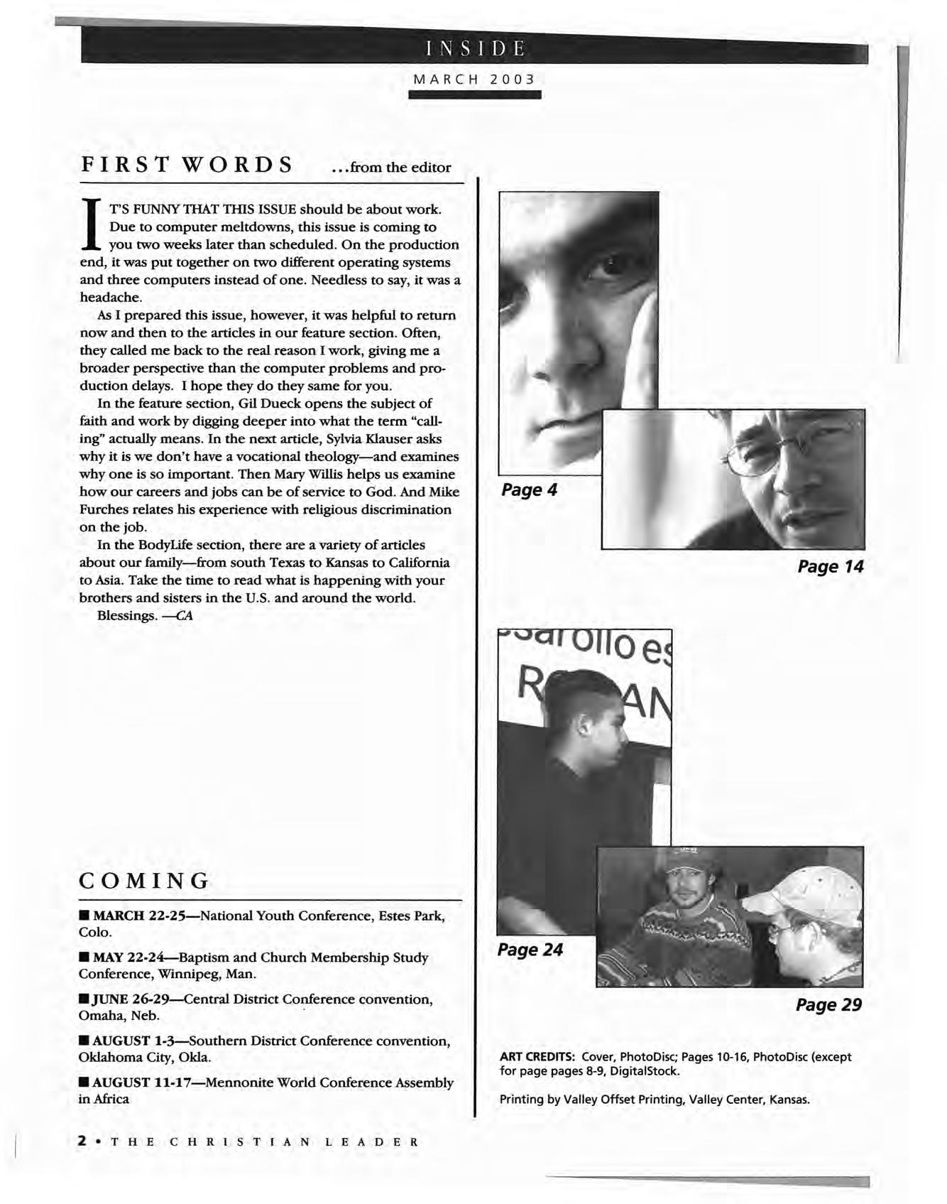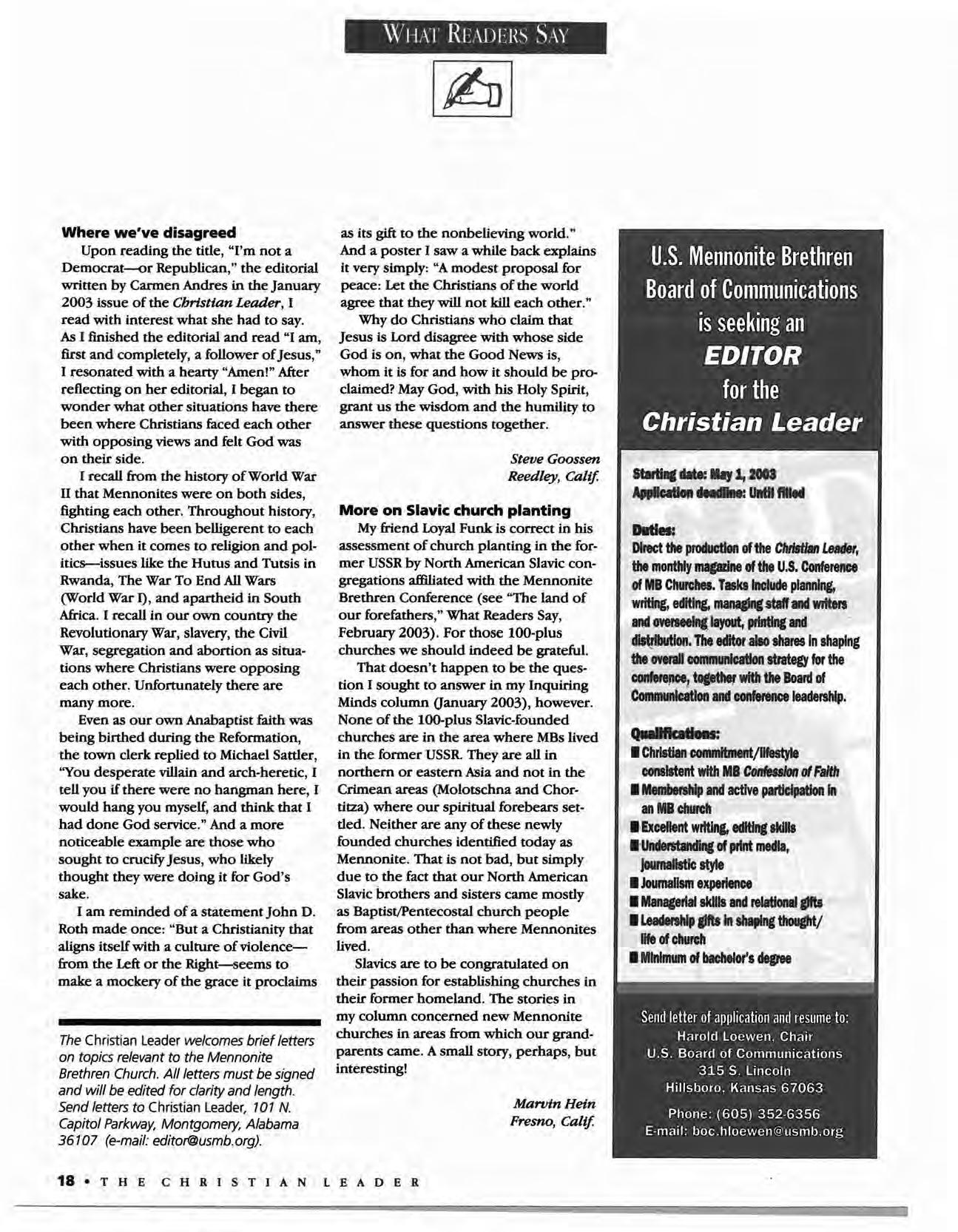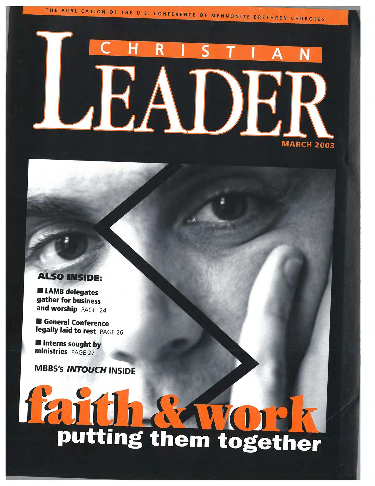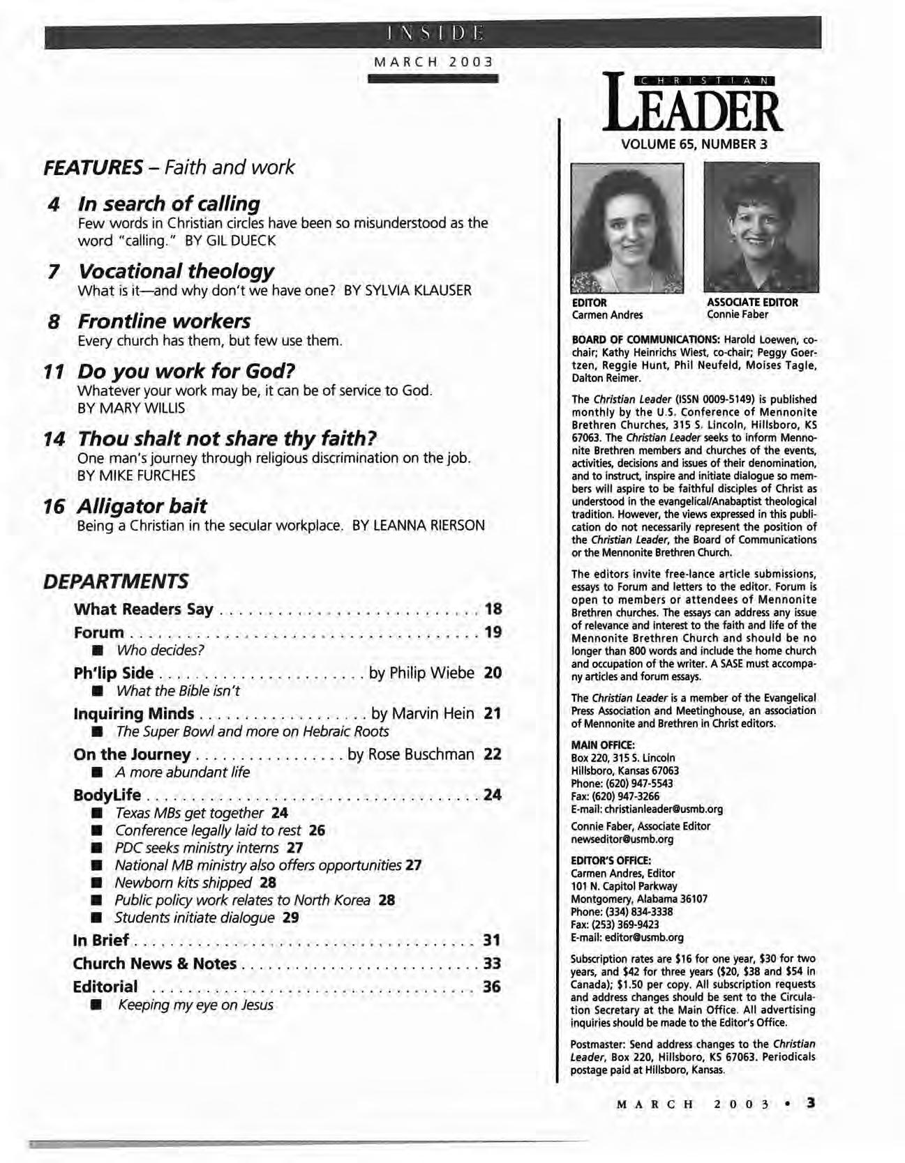 The Christian Leader (ISSN 0009-5149) is published monthly by the U.s. Conference of Mennonite Brethren Churches, 315 S. Lincoln, Hillsboro, KS 67063. The Christian Leader seeks to inform Mennonite Brethren members and churches of the events, activities, decisions and issues of their denomination, and to instruct, inspire and initiate dialogue 50 members will aspire to be faithful disciples of Christ as understood in the evangelical/Anabaptist theological tradition. However, the views expressed in this publication do not necessarily represent the position of the Christian Leader, the Board of Communications or the Mennonite Brethren Church.