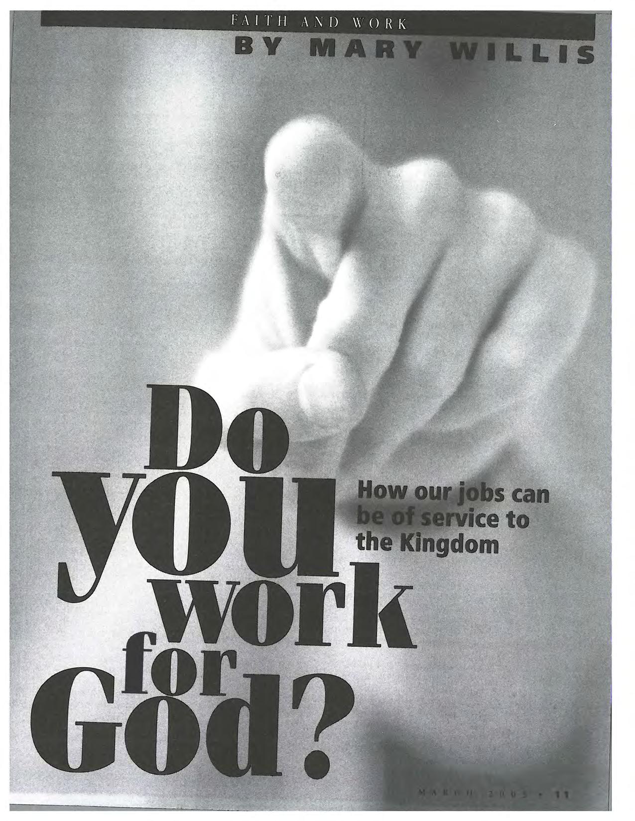 In the feature section, Gil Dueck opens the subject of faith and work by digging deeper into what the term "calling" actually means. In the next article, Sylvia Klauser asks why it is we don't have a vocational theology-and examines why one is so important. Then Mary Willis helps us examine how our careers and jobs can be of service to 60d. And Mike Furches relates his experience with religious discrimination on the job.