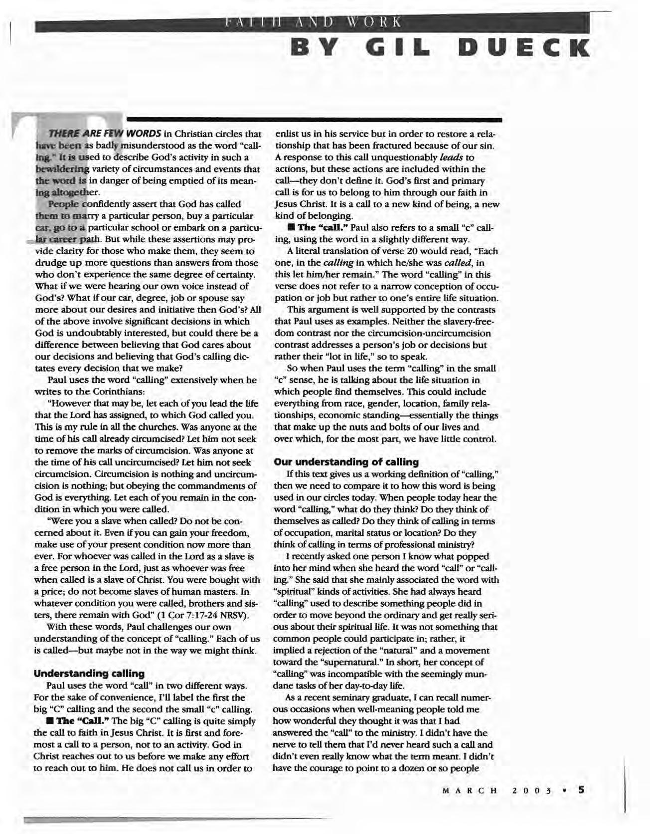 The fact that I was born into the Dueck family in Coaldale, Alta., is not a result of blind chance. The fact that I am a white male with a particular mixture of gifts and interests is not an accident. These are all part of the small "c" calling that God has assigned to me. By instructing the Corinthians to remain in their small "c" callings Paul seems to be saying that this kind of calling has spiritual significance that cannot be passed over lightly.