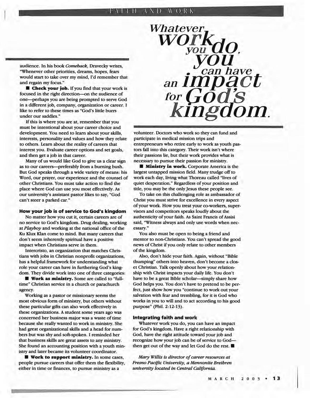 means or a part of a larger calling. I share that pastor's burden. I want to help people understand that faith is not a part of life-it is our life. I want people to know the freedom Jesus brings. Understanding that my job as editor (or any other job, for that matter) was a means to help people toward that freedom took a lot of the anxiety and fear away. God could use any job-or lack of job-to further that calling. Bringing people to Jesus and helping them as they journey toward transformation can happen no matter what our job or whether we work or not. That day, my world expanded more toward the way God sees it, I suspect