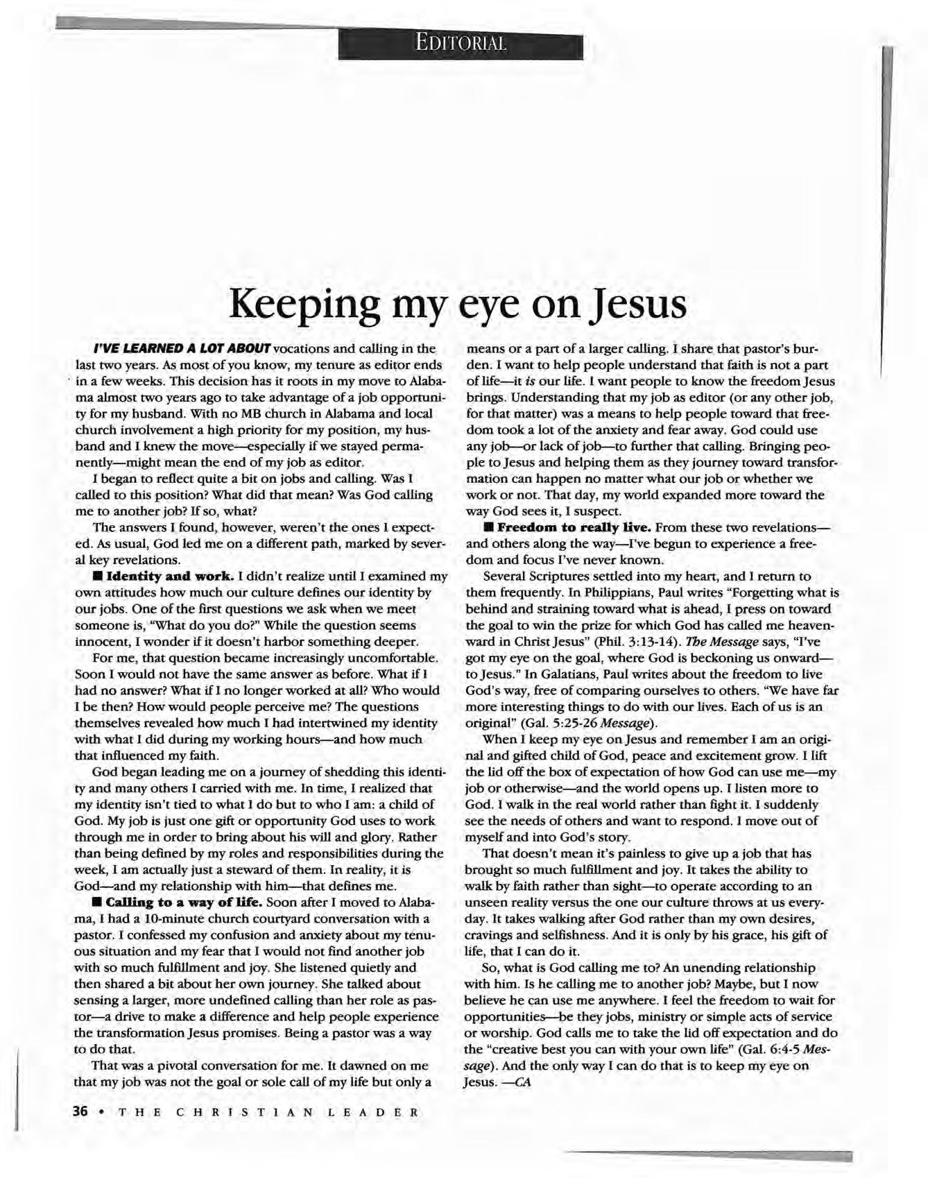 I'VE LEARNED A LOT ABOUT vocations and calling in the last two years. As most of you know, my tenure as editor ends . in a few weeks. This decision has it roots in my move to Alabama almost two years ago to take advantage of a job opportunity for my husband. With no MB church in Alabama and local church involvement a high priority for my position, my husband and I knew the move--especially if we stayed permanently-might mean the end of my job as editor.