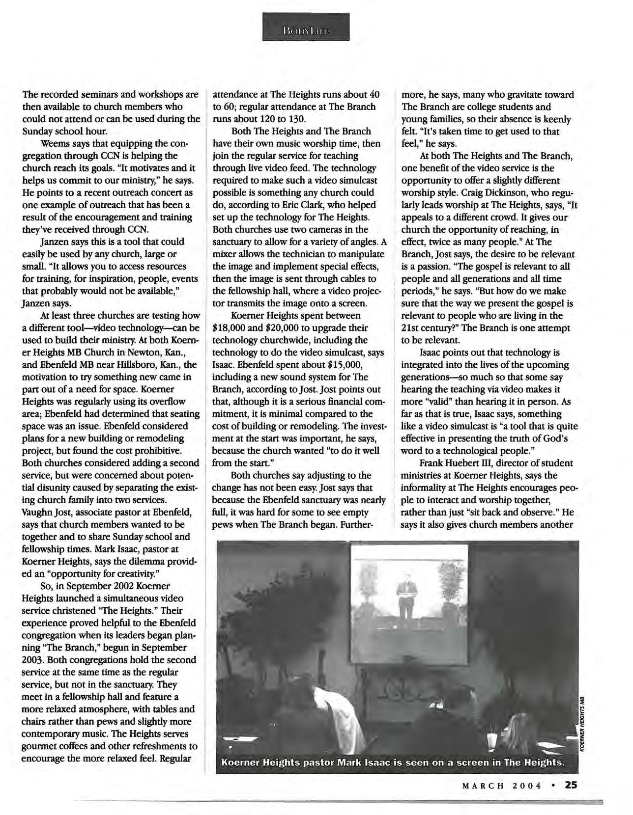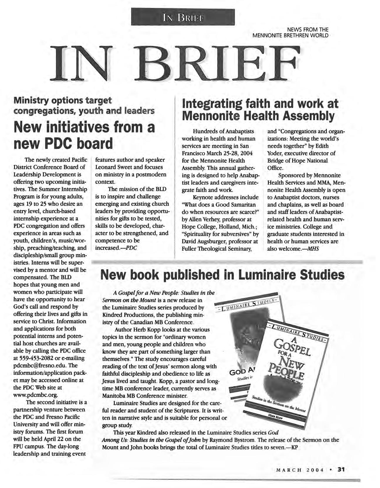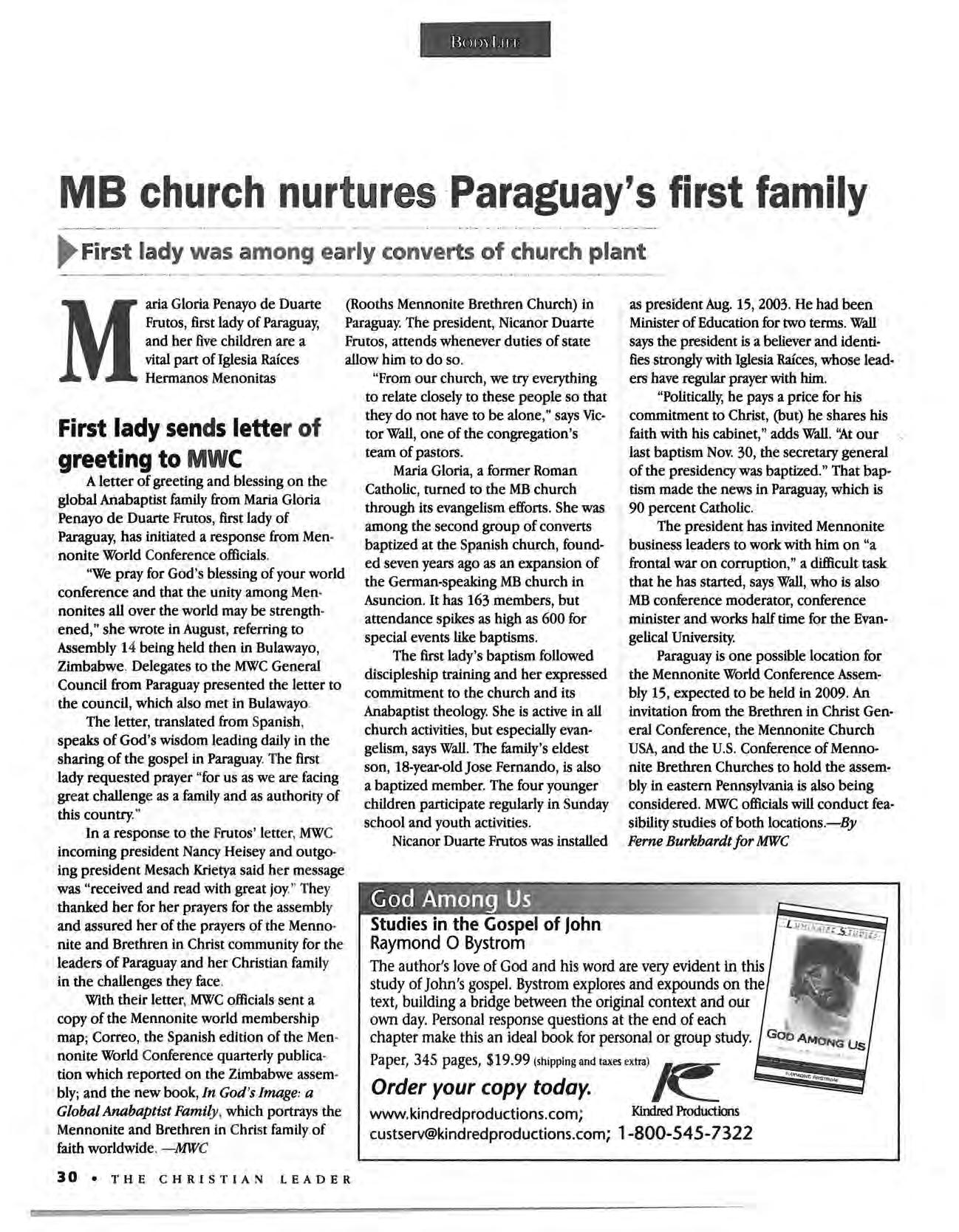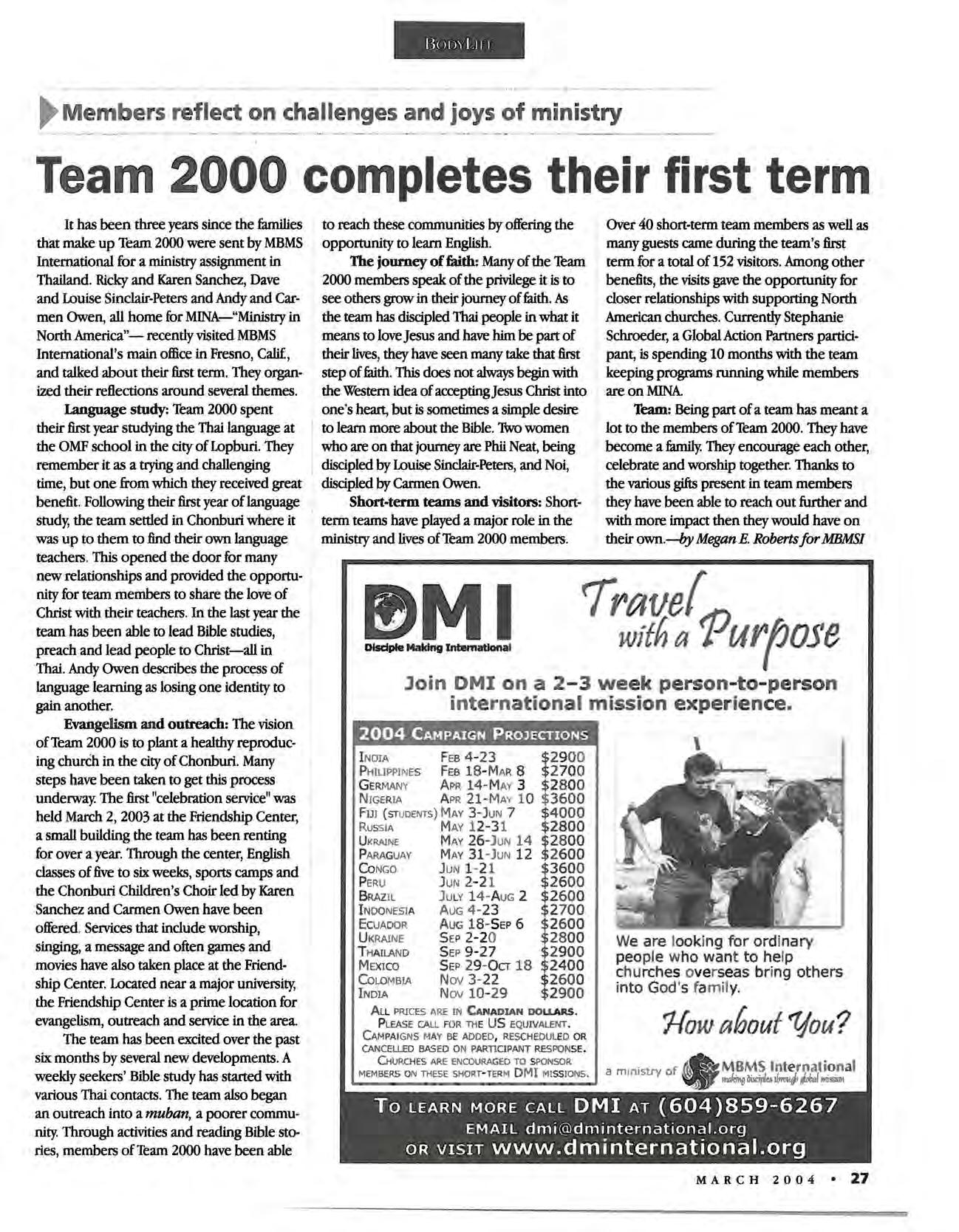 The March news section includes articles describing how Mennonite Brethren congregations are using technology to enhance their ministry, about the connection between Paraguay's new president and a local Mennonite Brethren church, and sharing reflections from members of MBMSI's Team 2000 after one term of service in Thailand. --CF