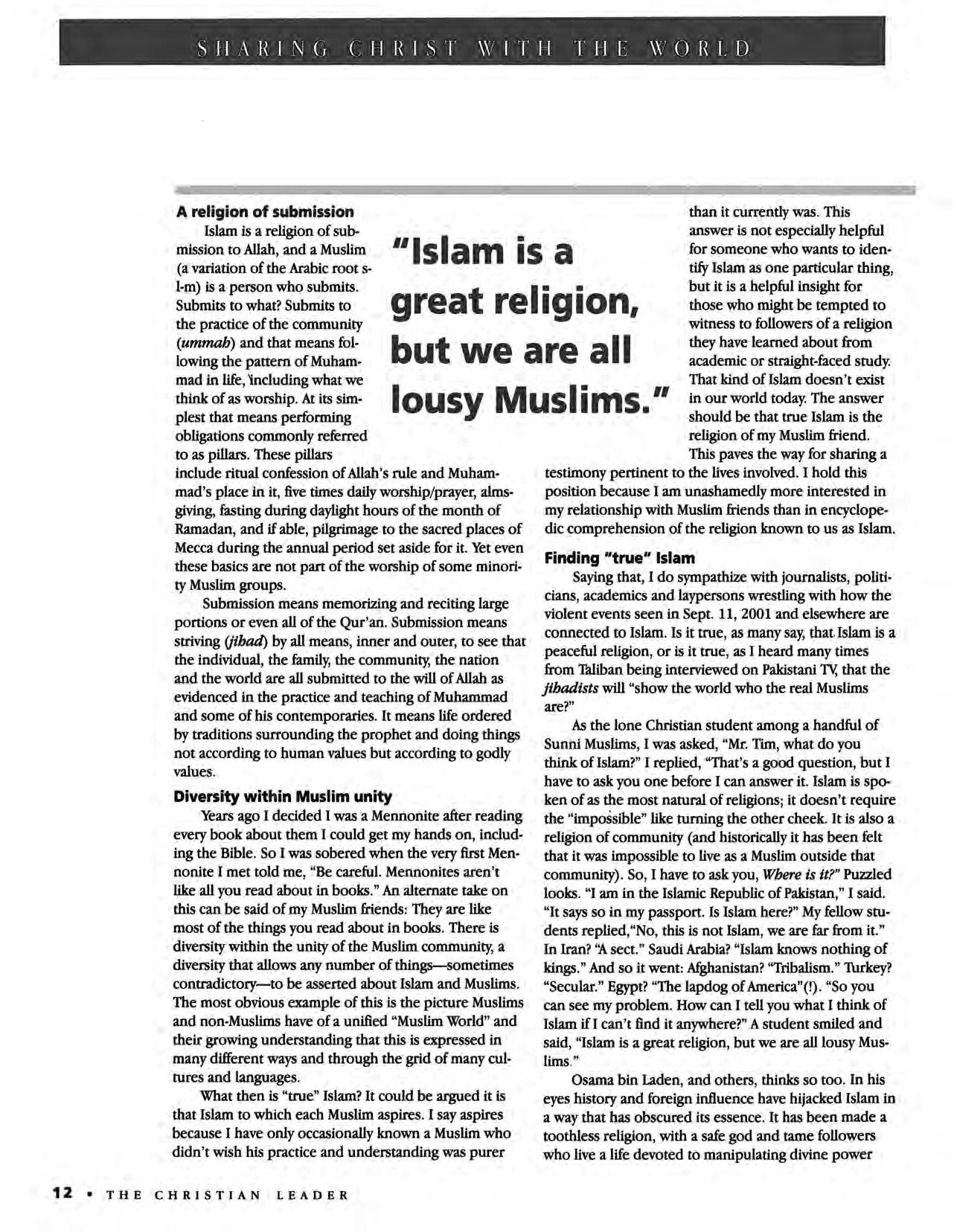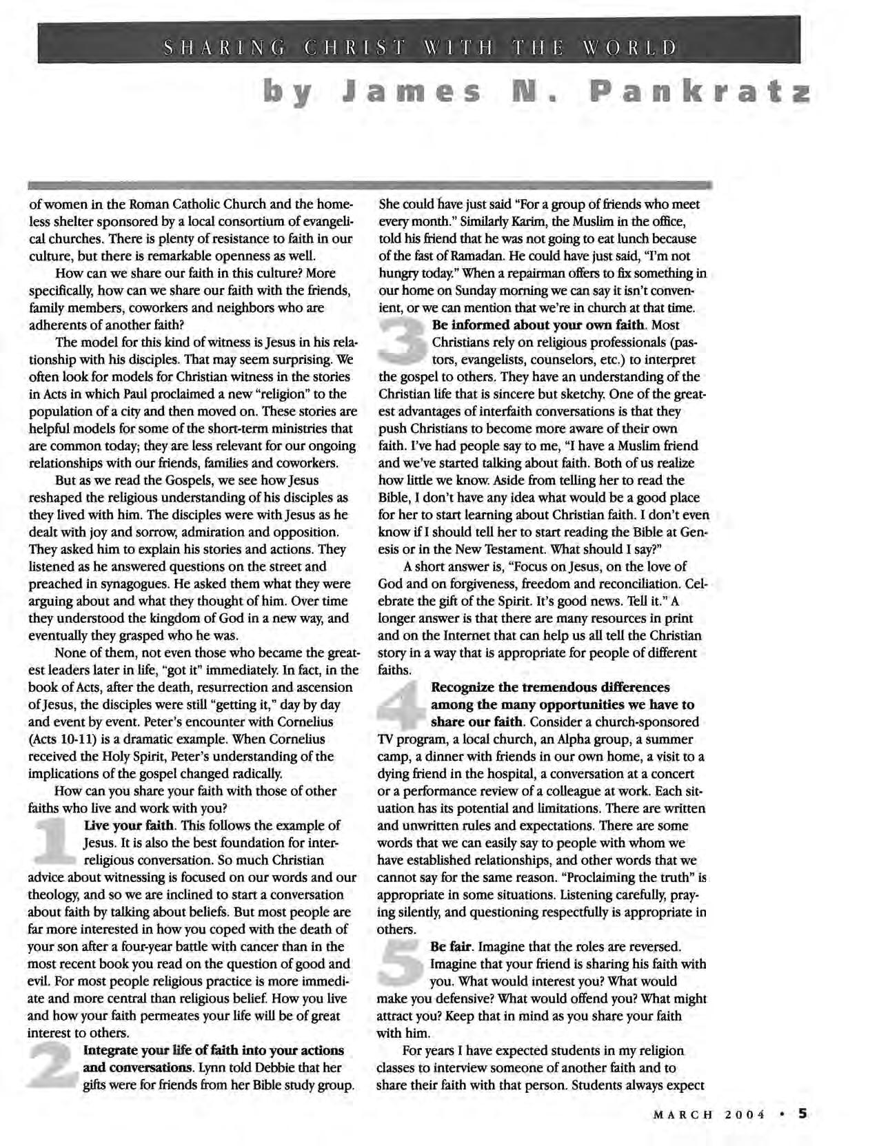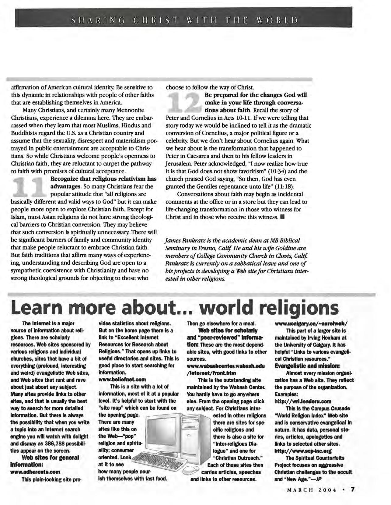The confession also says that we will "treat people of other faiths and philosophies with respect, but lovingly and urgently proclaim Christ. ... " Our country is home to people who have immigrated from other countries and other internationals who live here temporarily. We have an opportunity to share our faith with these people and to plant a kingdom seed in their lives. The first feature article by James Pankratz offers some practical suggestions for how to follow Jesus' model for witnessing It is followed by stories and reflections from individuals who share their faith on a regular basis with individuals who follow Islam, Buddhism and Hinduism.